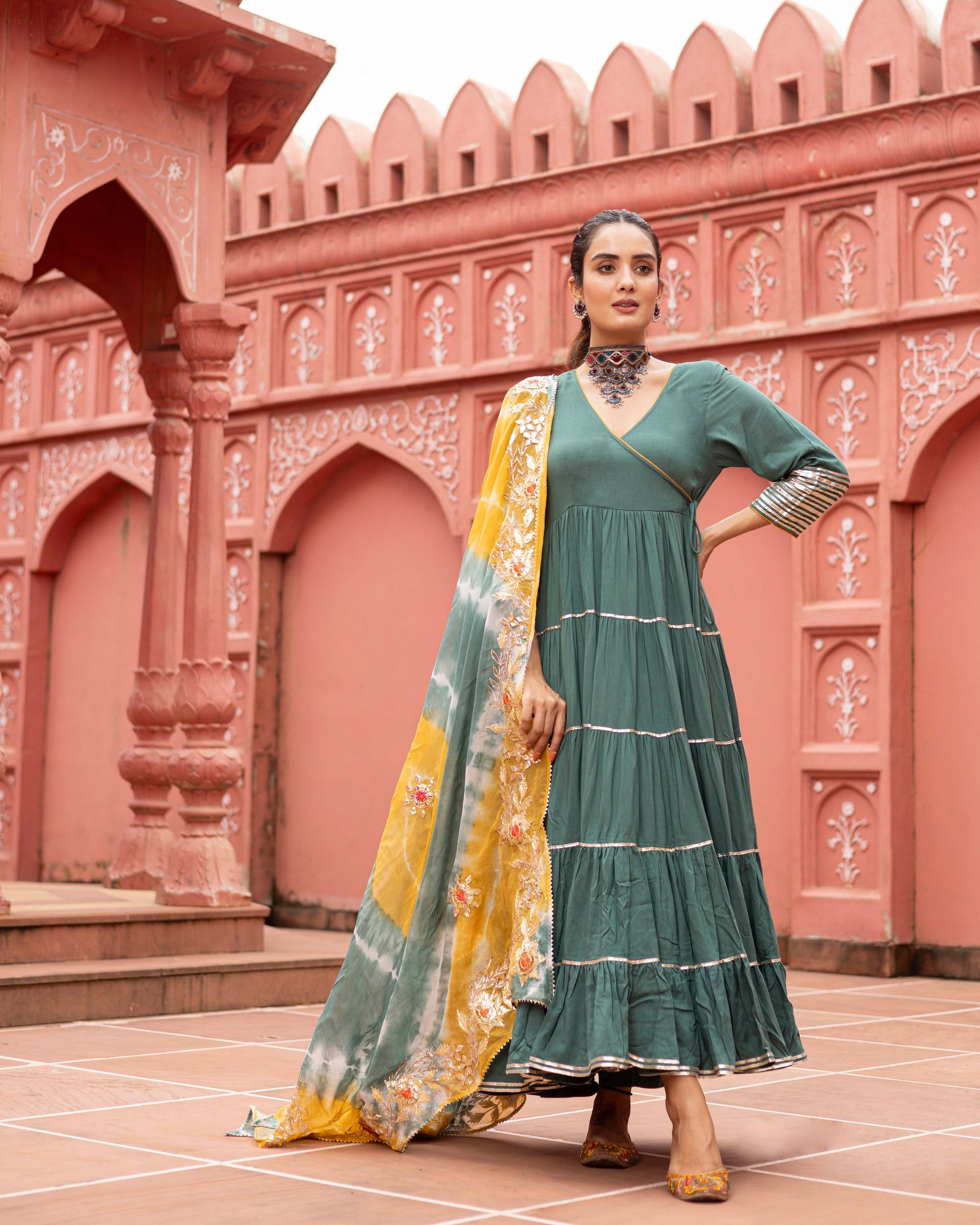 This set include angrakha Anarkali with straight pant and gottpatti dupatta.