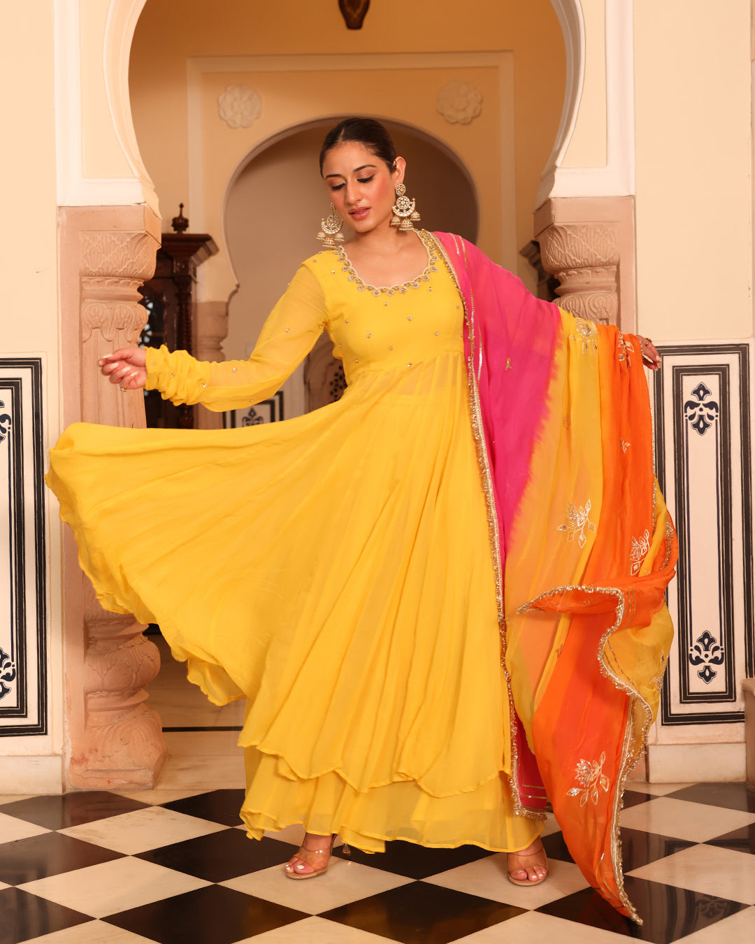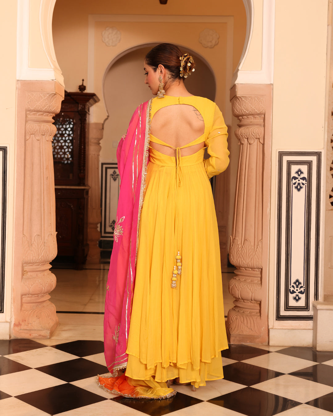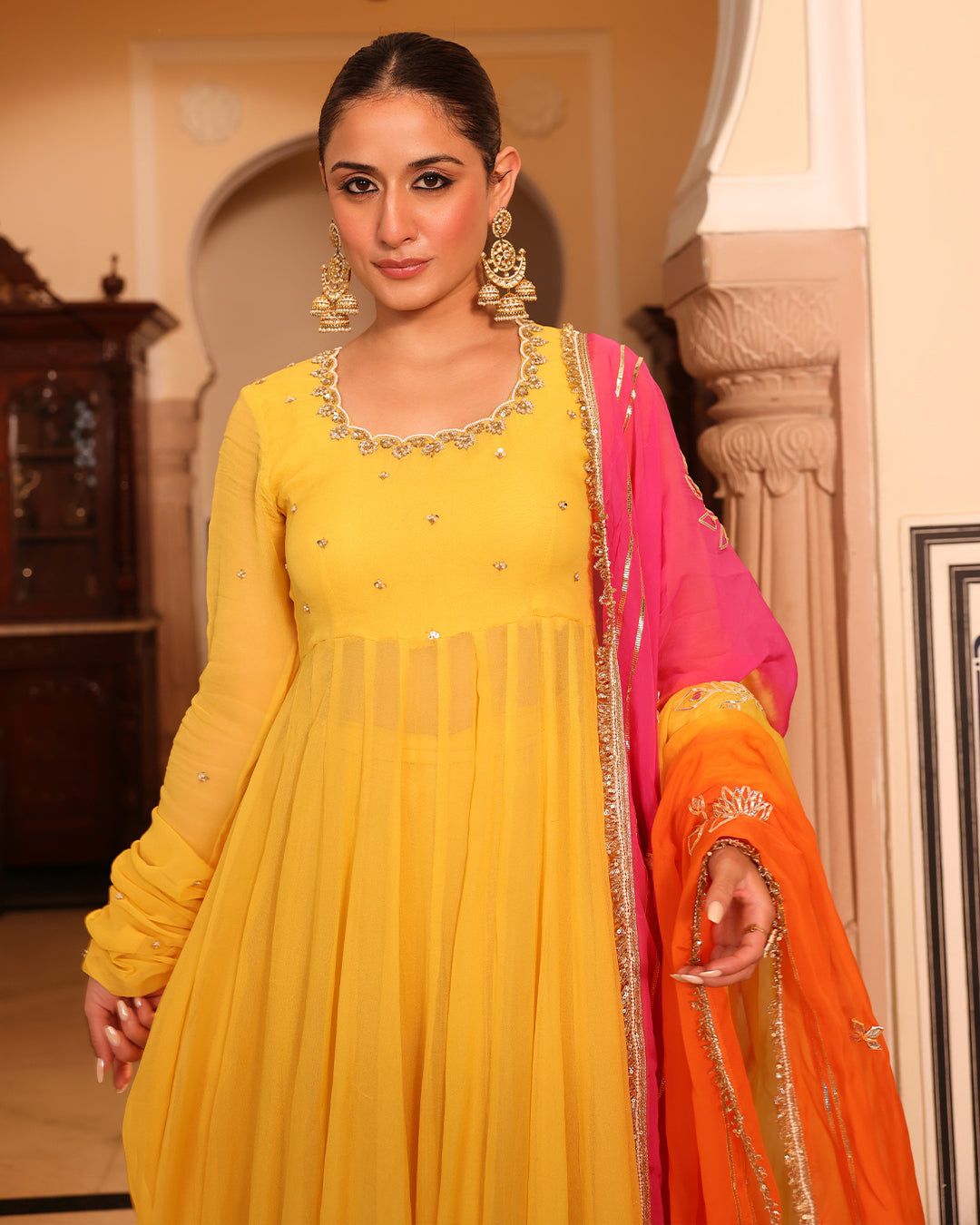 This set includes kurta with sharara and dupatta. Kurta lined with mul. Kurta is detailed with sequence hand work And dupatta is detailed with gotta patti work