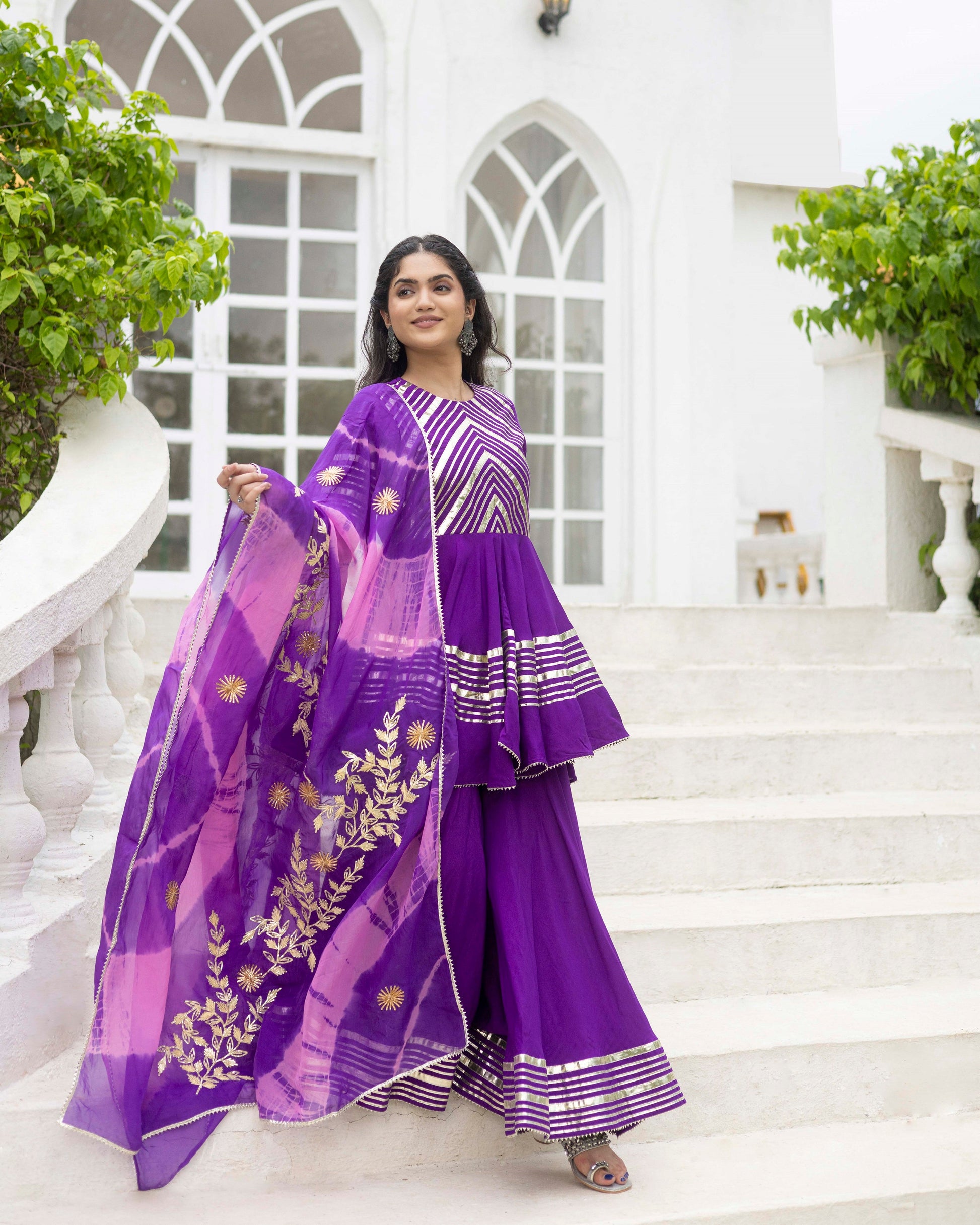 This set includes Kurta with sharara and dupatta. Our purple sharara set in cotton silk, boasts delicate gotta details and a beautifully yoke, adding a touch of sophistication to your ensemble. Perfect for wedding, this versatile outfit ensures both comfort and style