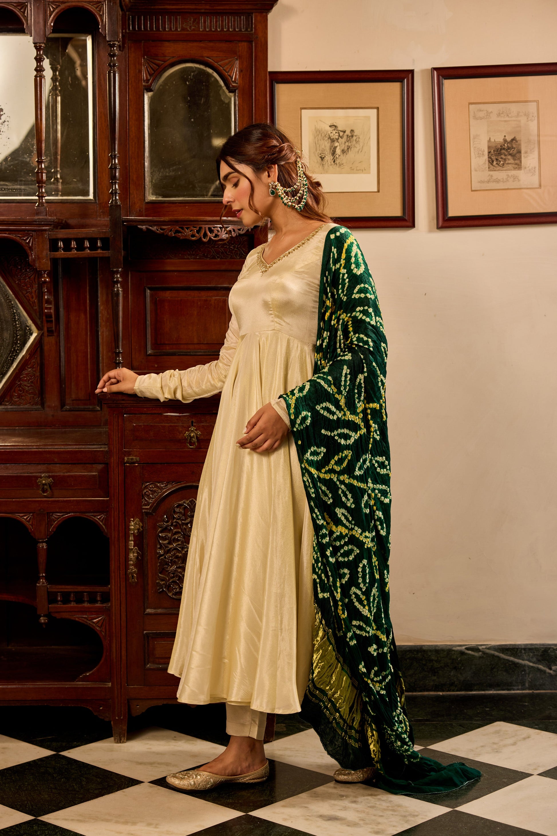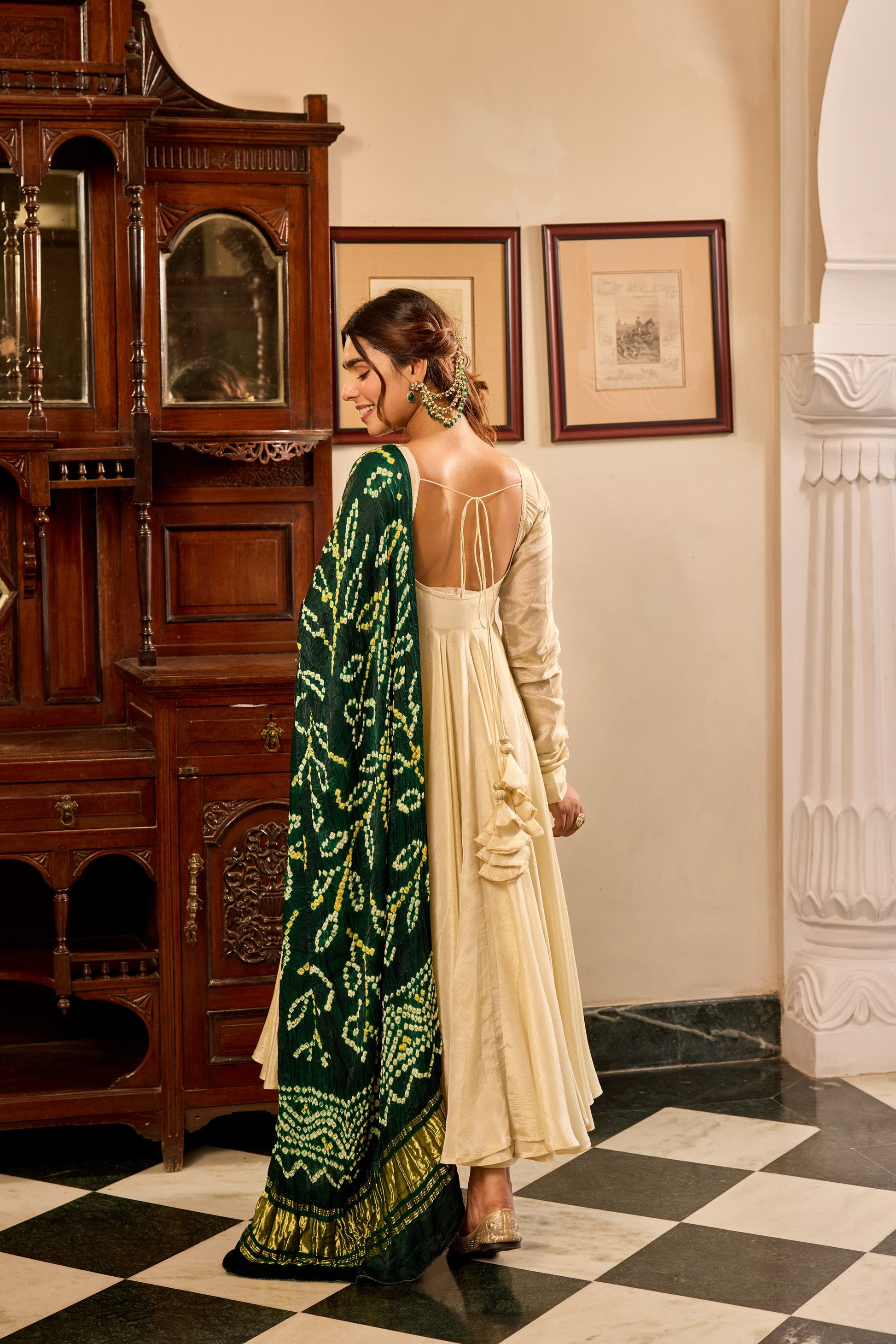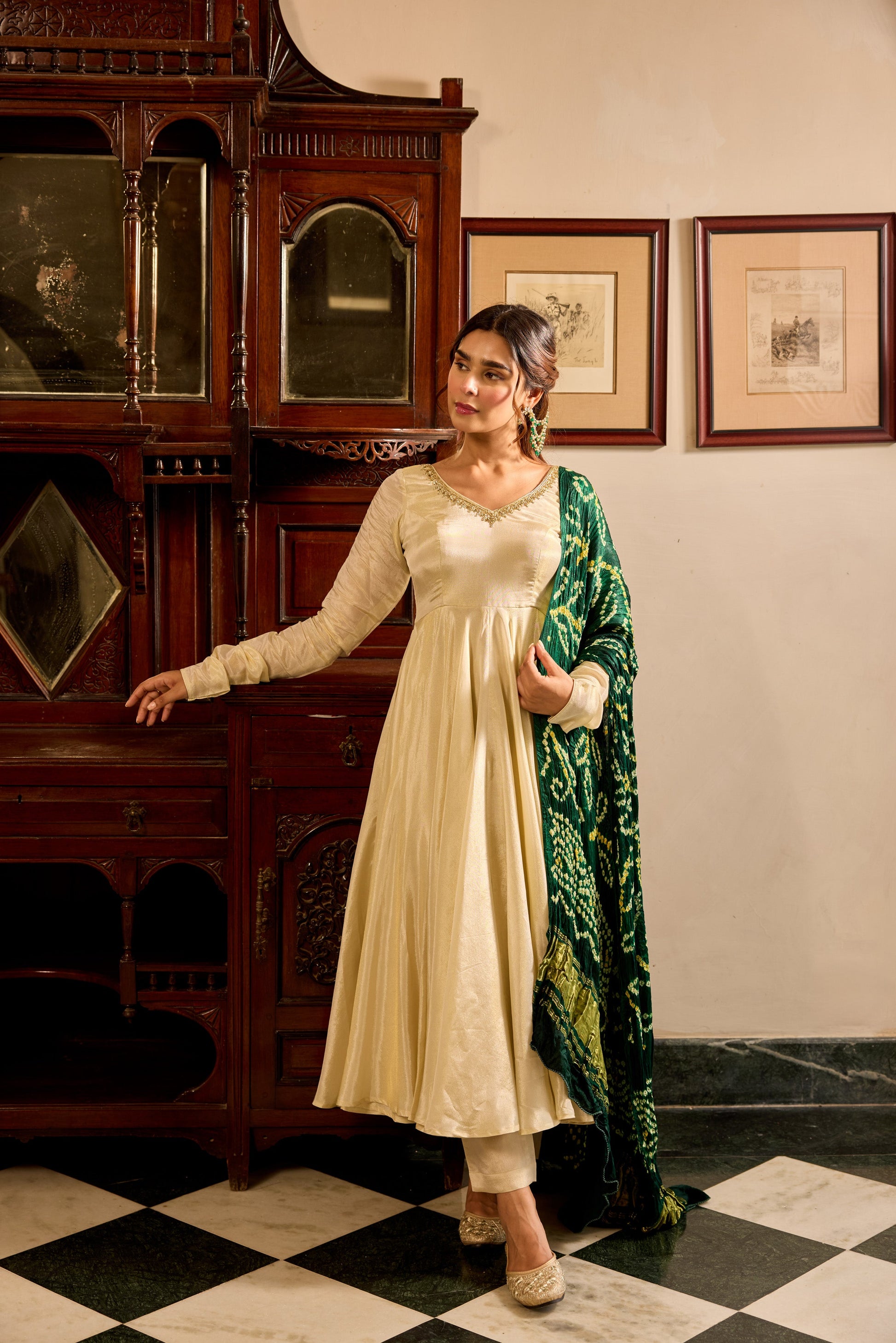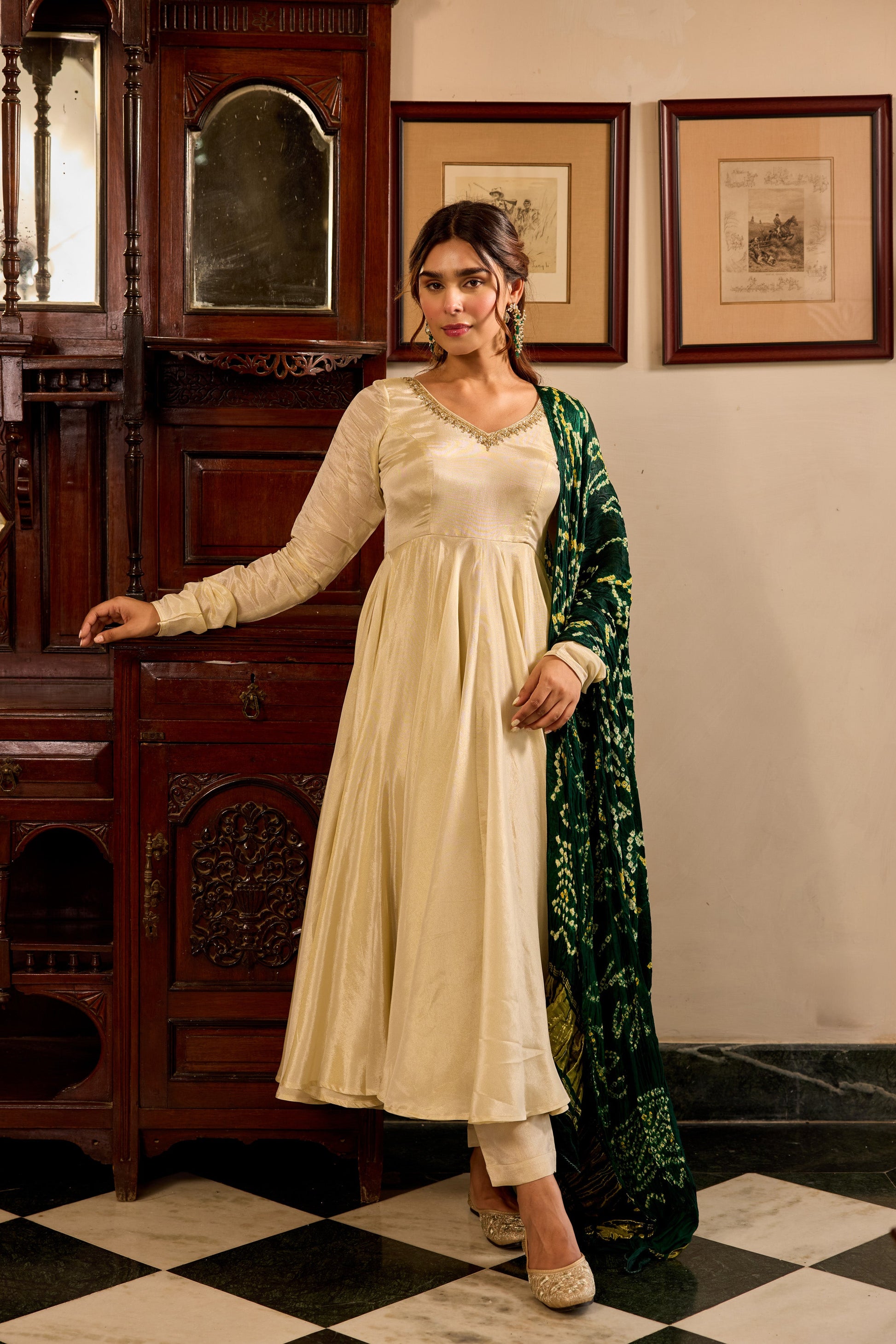 Tissue Green Bandhej Anarkali Suit Set