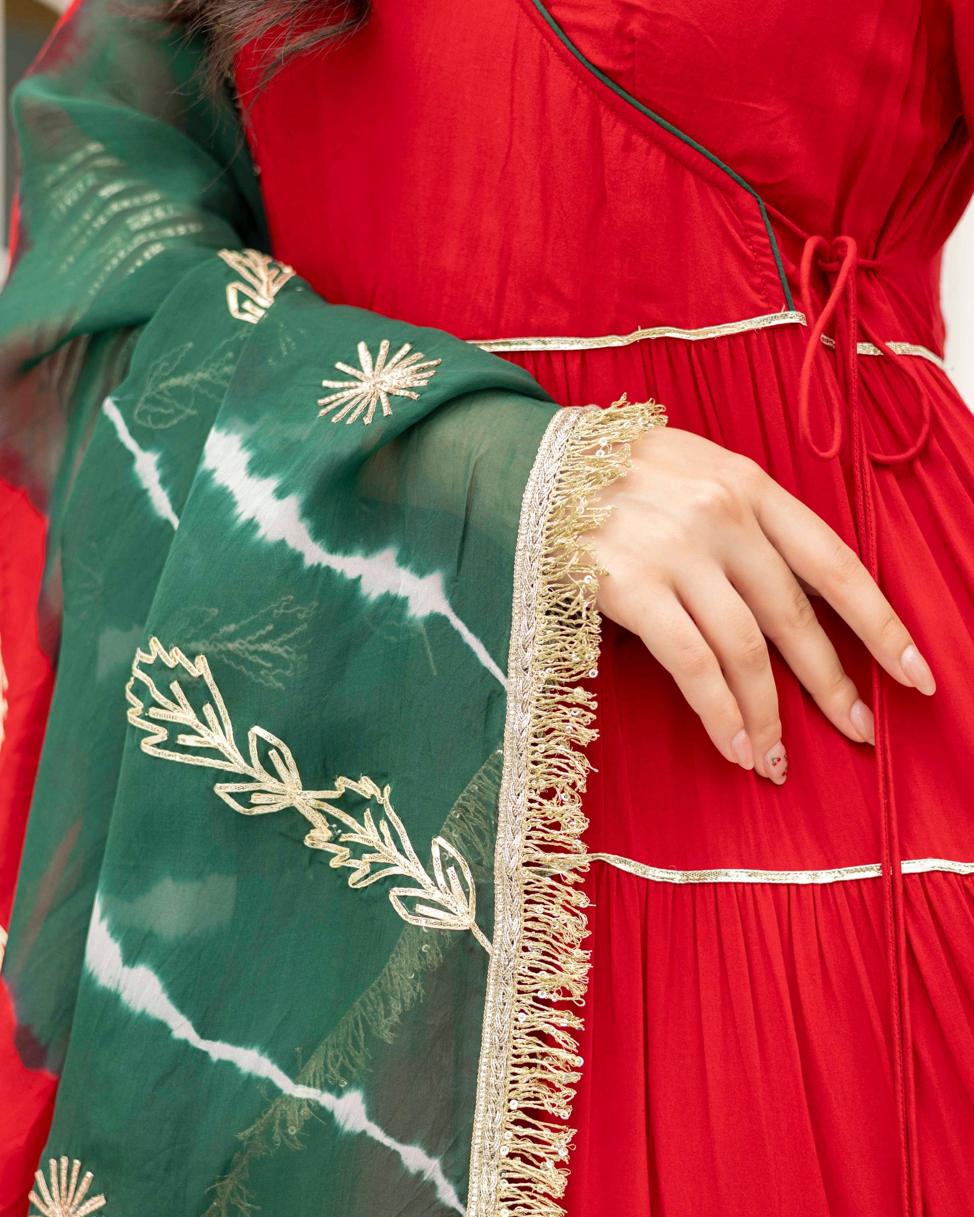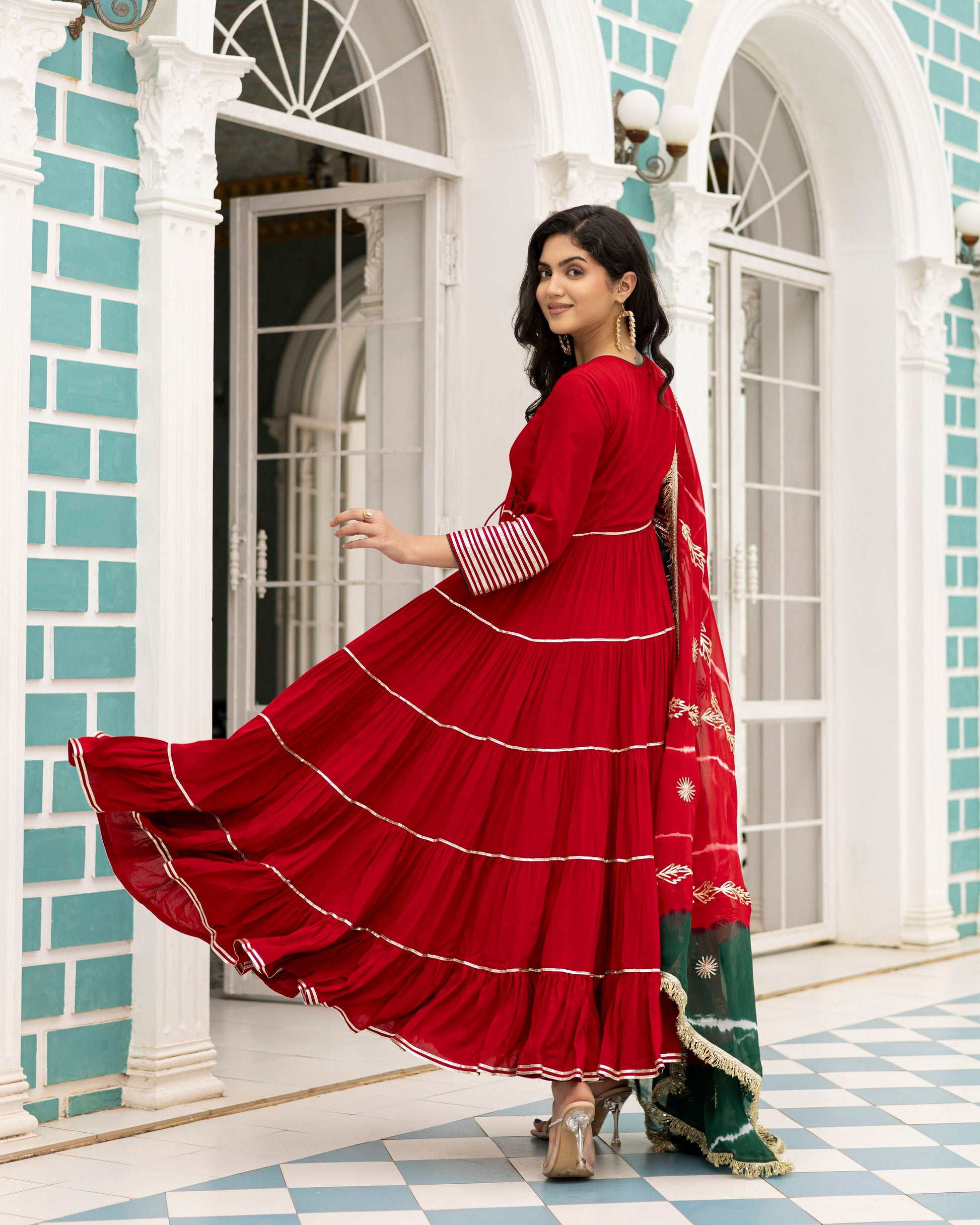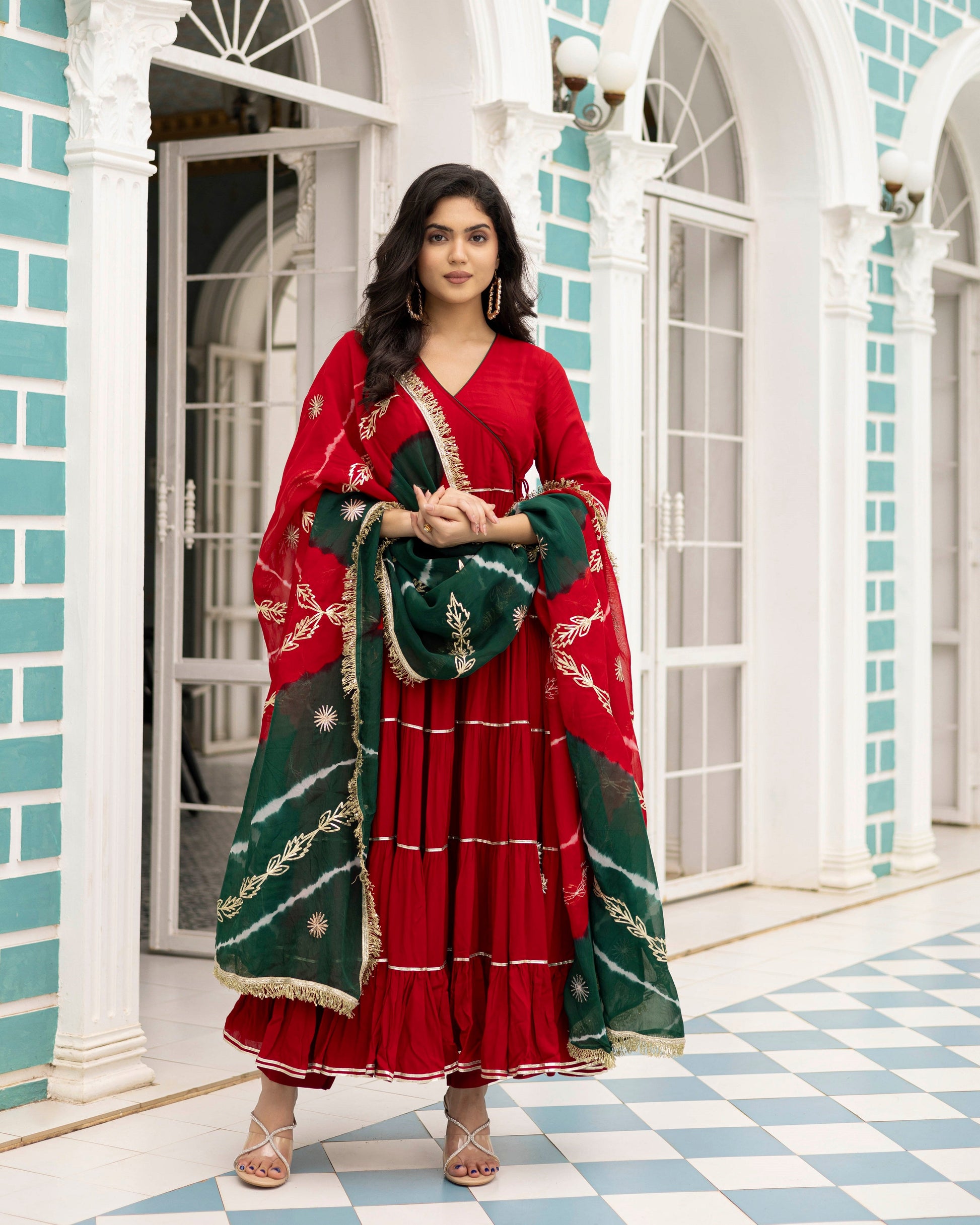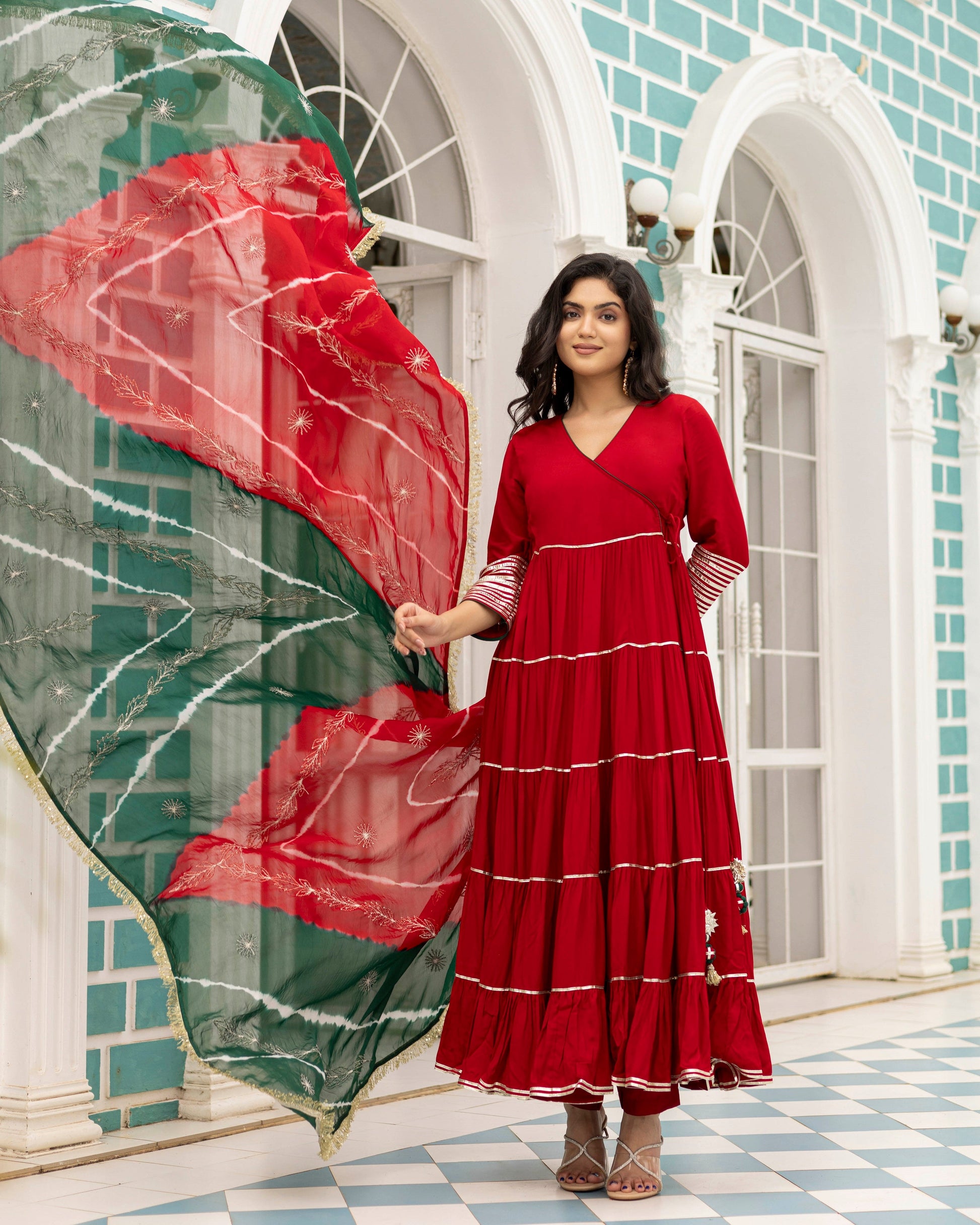 Gulbahaar Bright Maroon Angrakha Anarkali With Straight pants And Dupatta Set Of 3