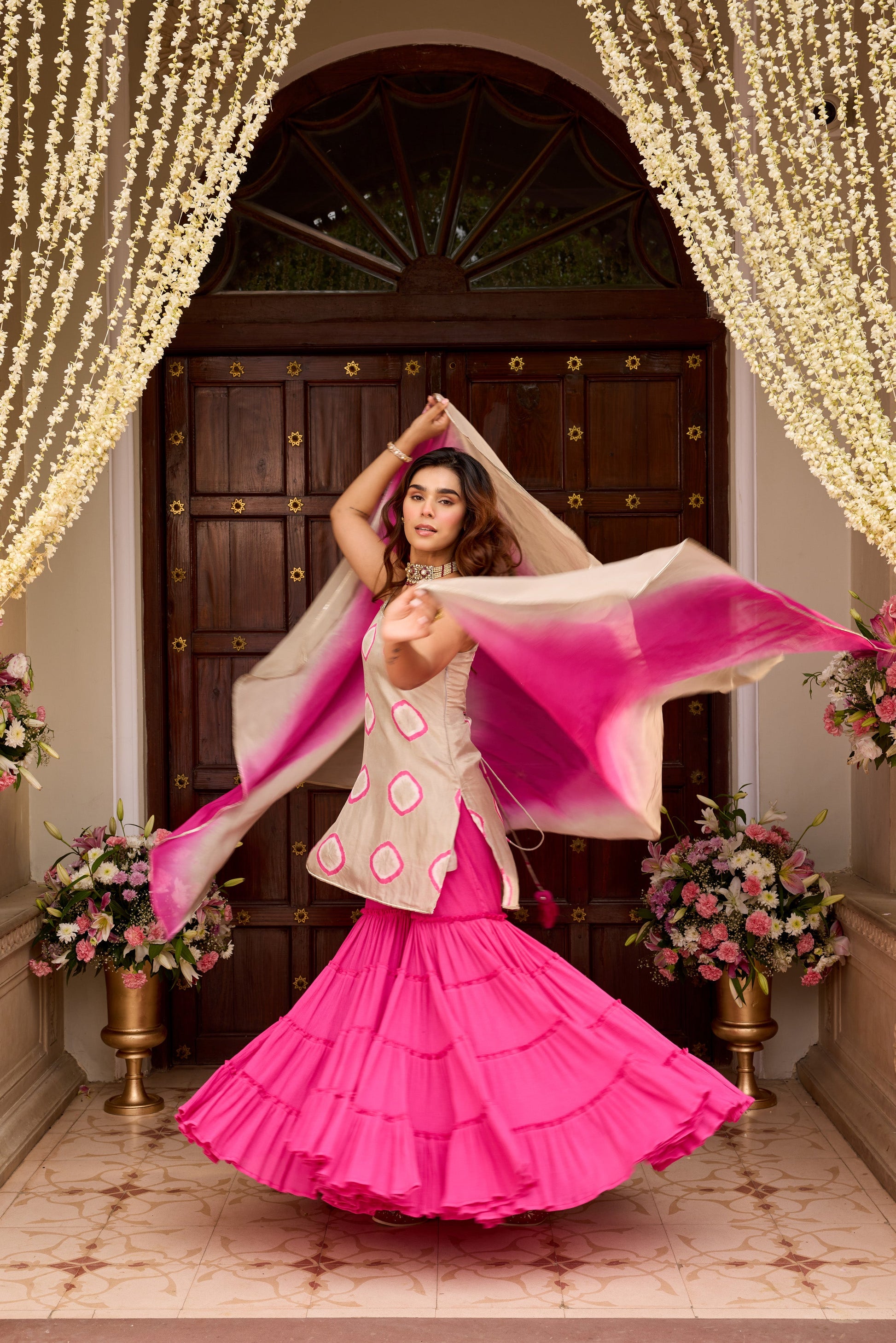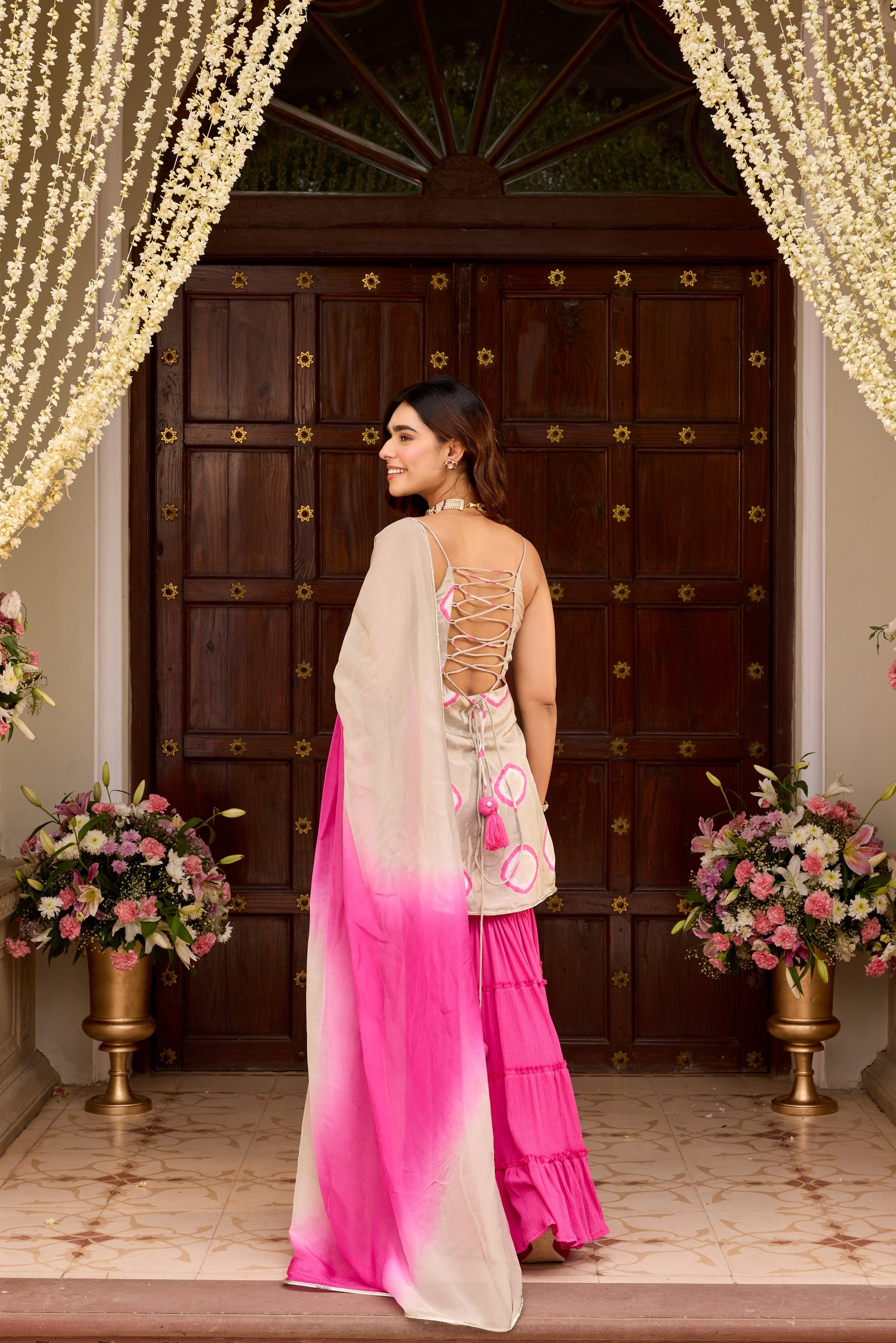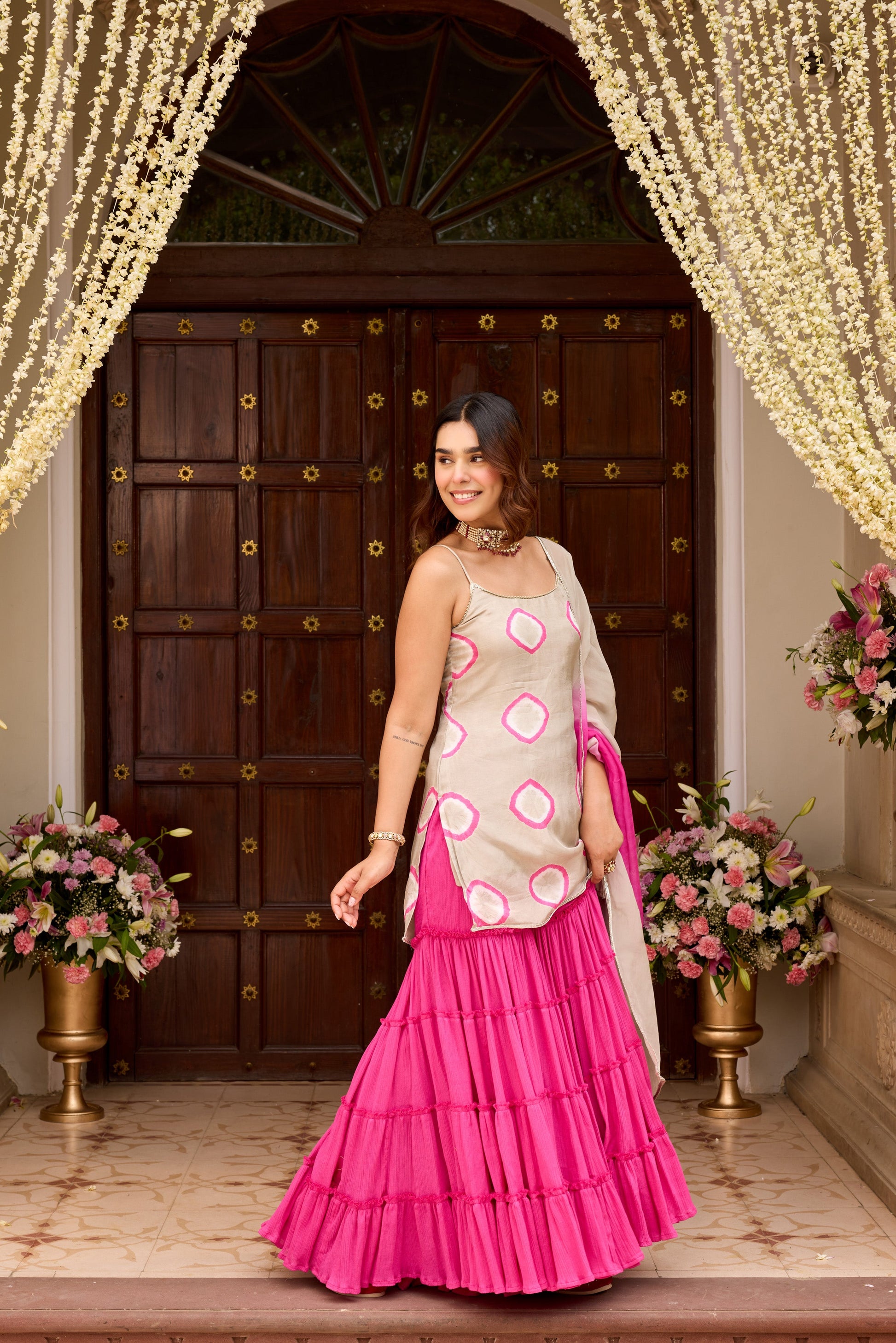 This set includes kurta with sharara and dupatta. Kurta lined with mul.