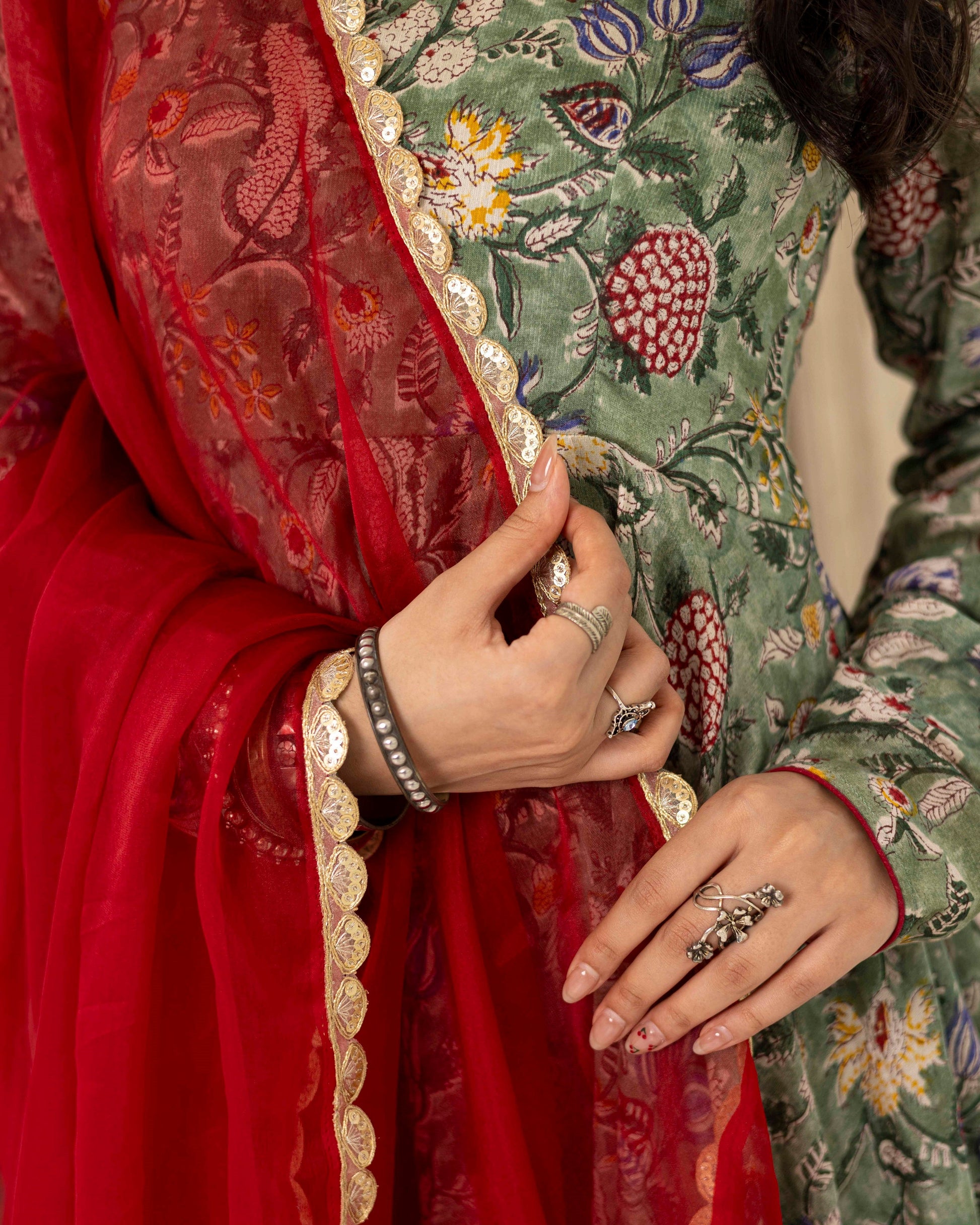 This set includes anarkali with pant and dupatta. Anarkali lined with mul. Dupatta is detailed with lace.