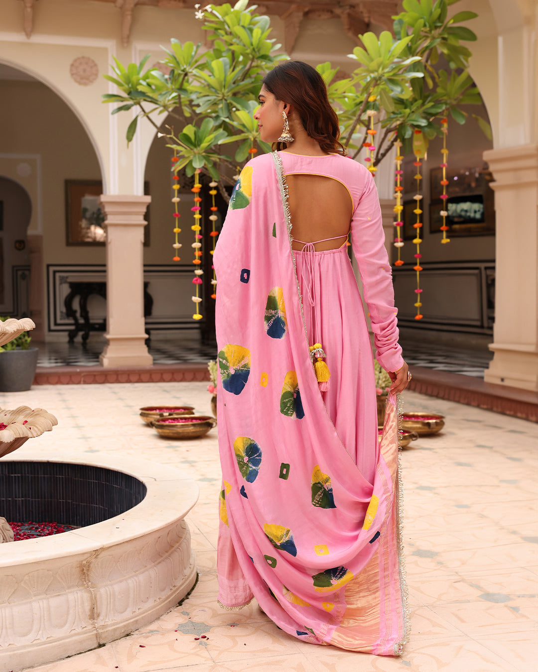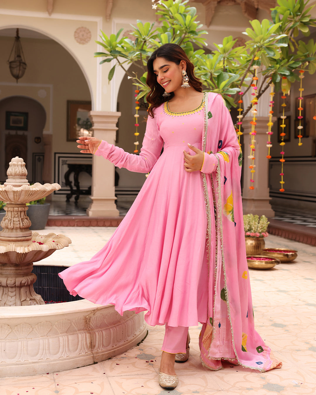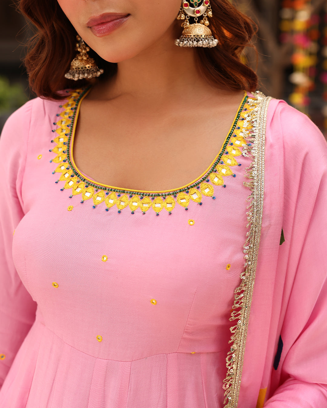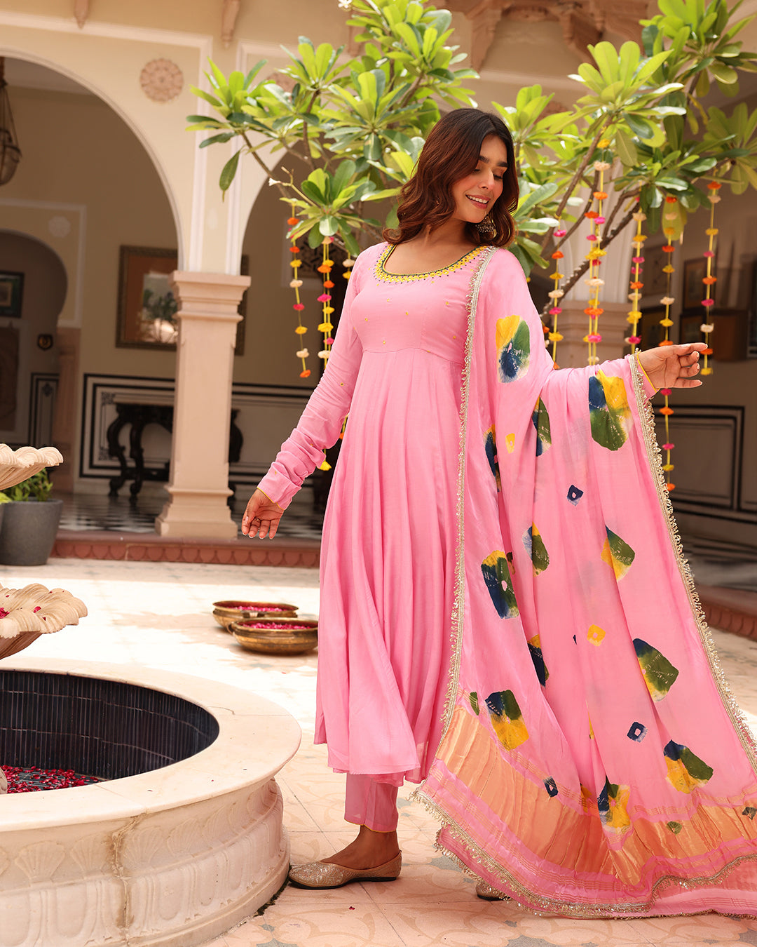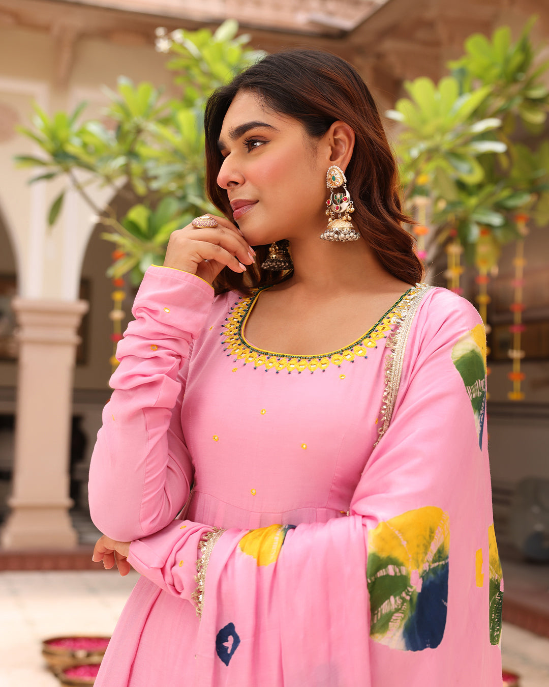 Slay every occasion in our light pink suit set. Crafted in a light pink Kurta with Mirror work , this suit set features a full-length stylish kurta with straight pants and silk tie & die dupatta