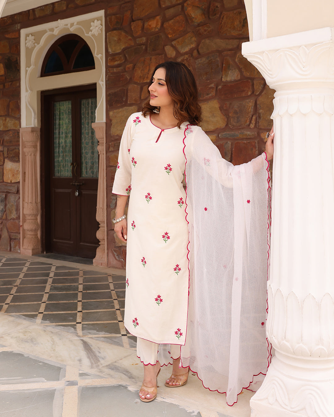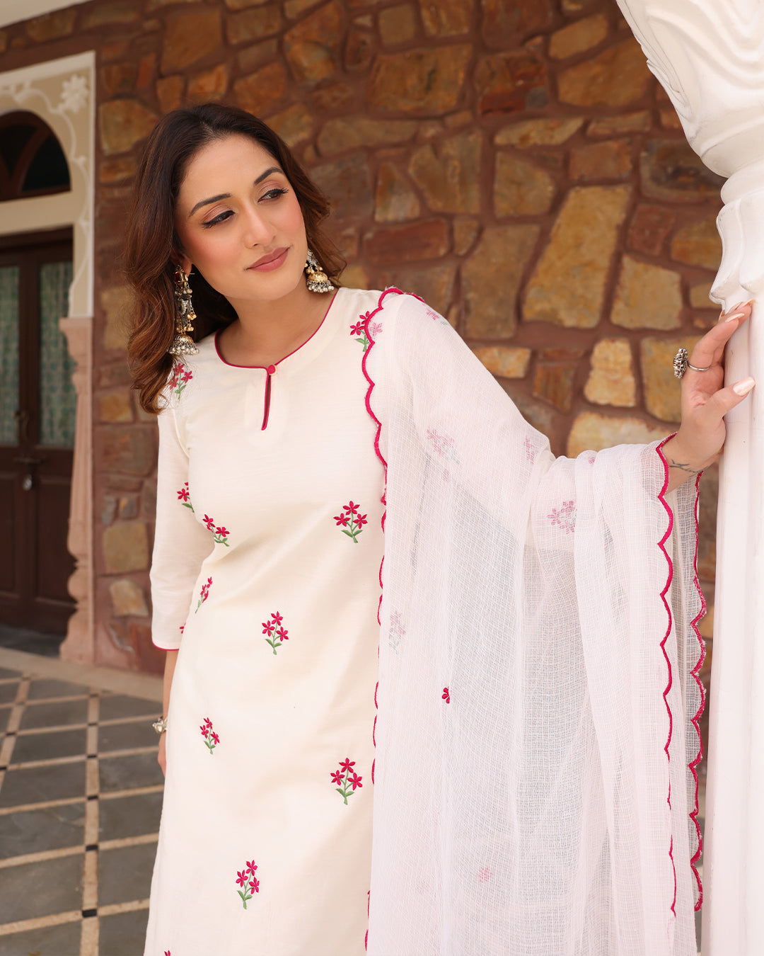 This set include Straight Kurta with pant and Kota Doria dupatta.Kurta and dupatta is embroidered