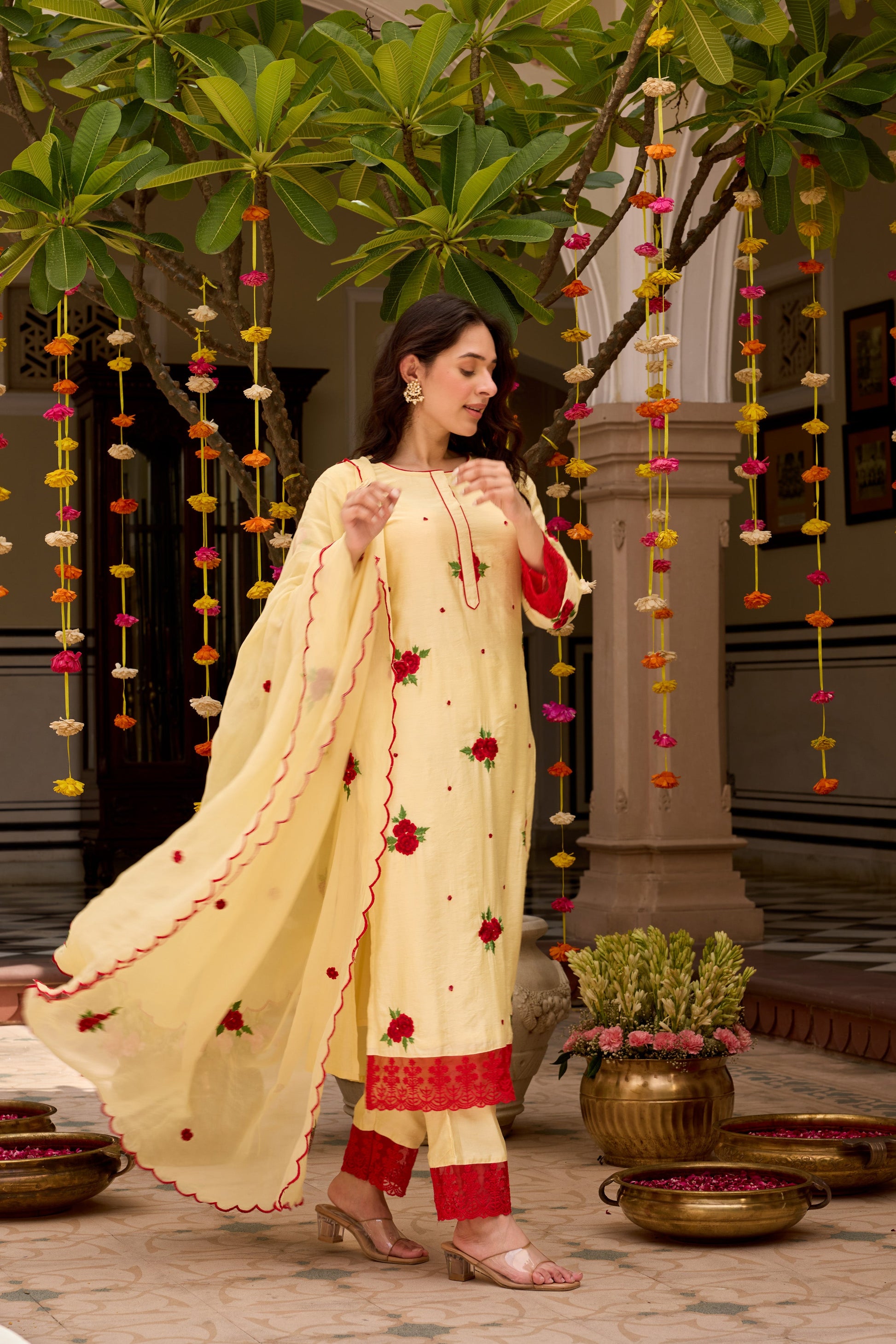 This set include Straight Kurta with pant and Organza dupatta.Kurta and dupatta is embroidered