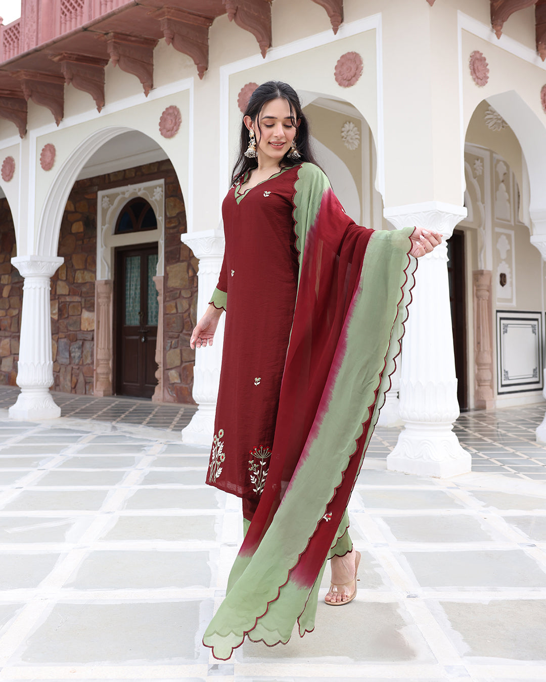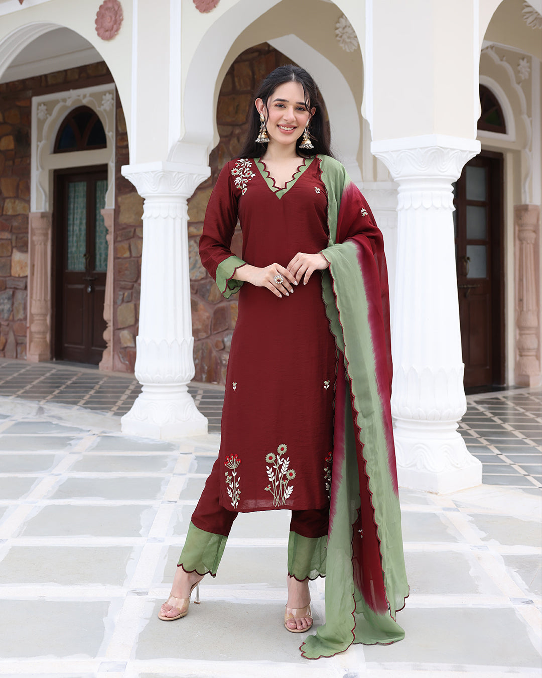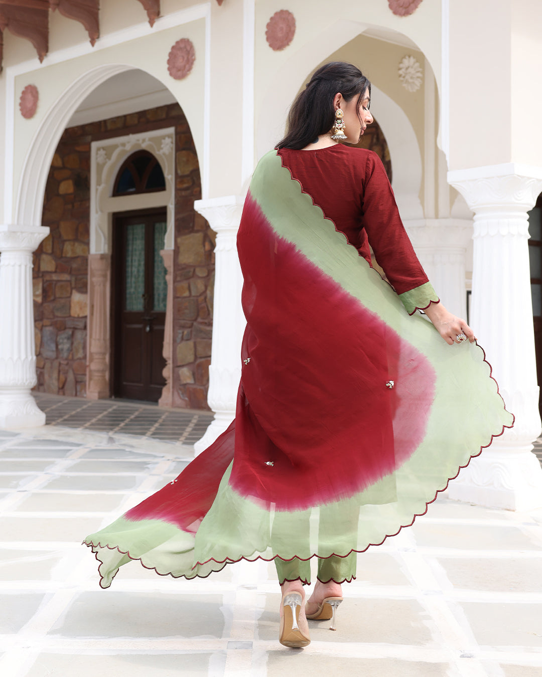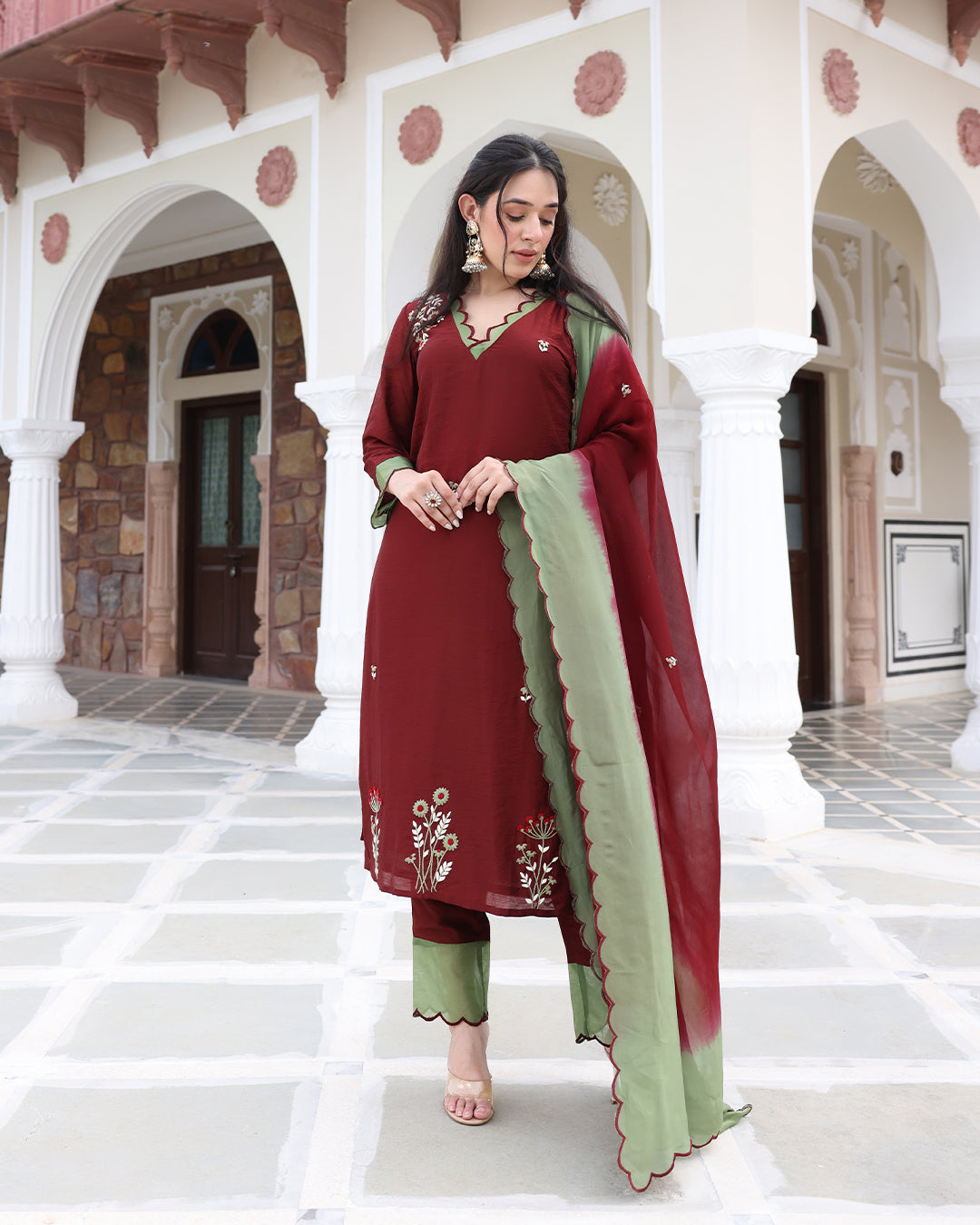 This set include Straight Kurta with Pant and Organza Hand work dupatta.