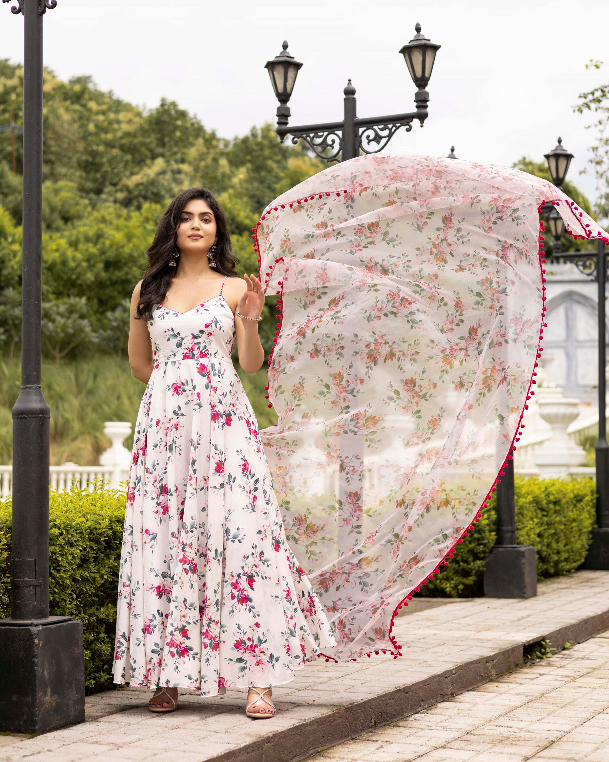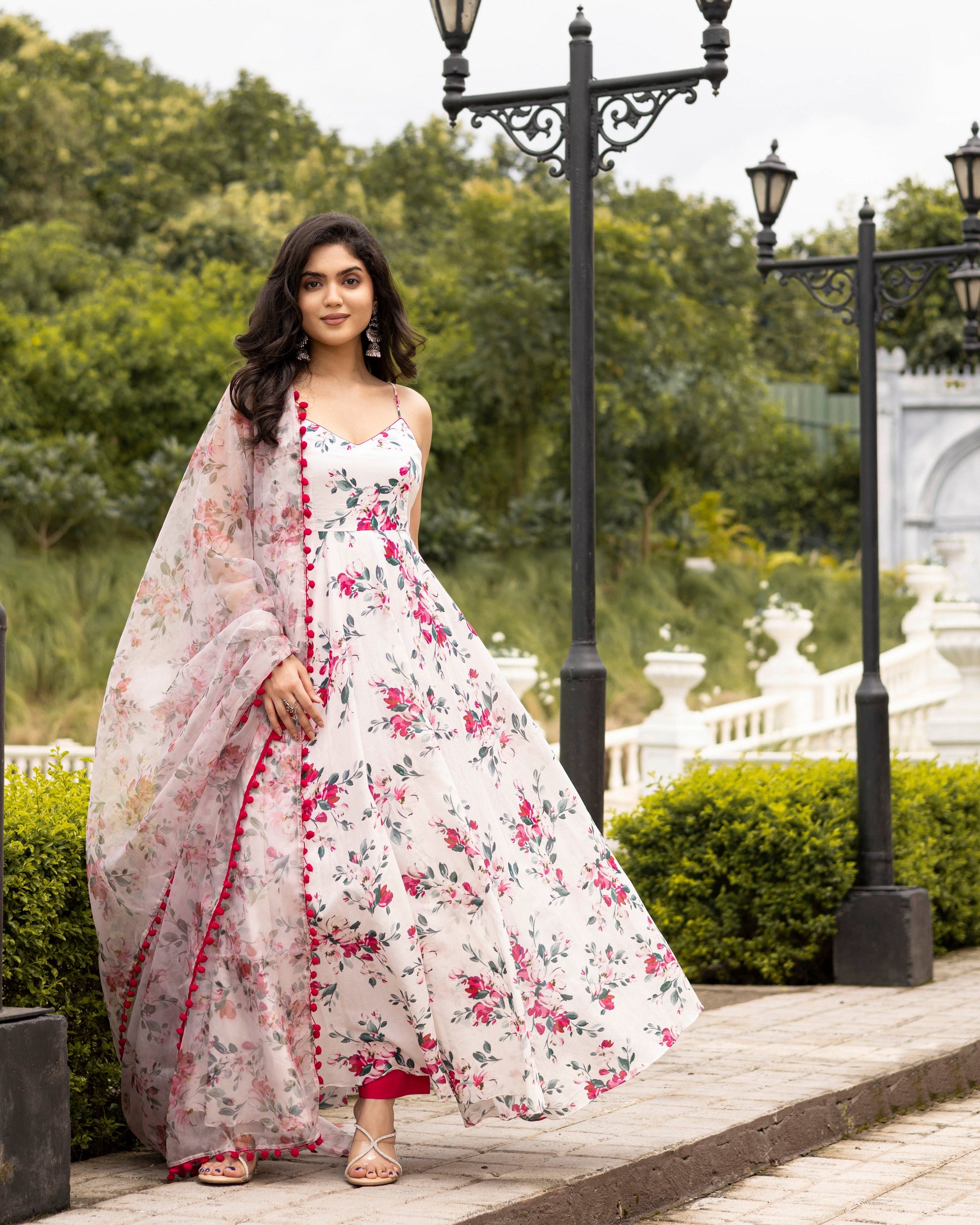 This set include Floral Digital printed Anarkali with straight pants and dupatta. Anarkali with mulmul lining. Floral print dupatta is detailed with lace.