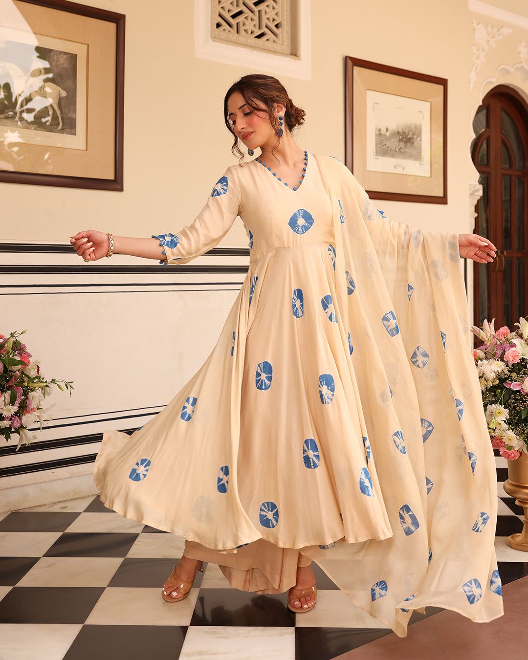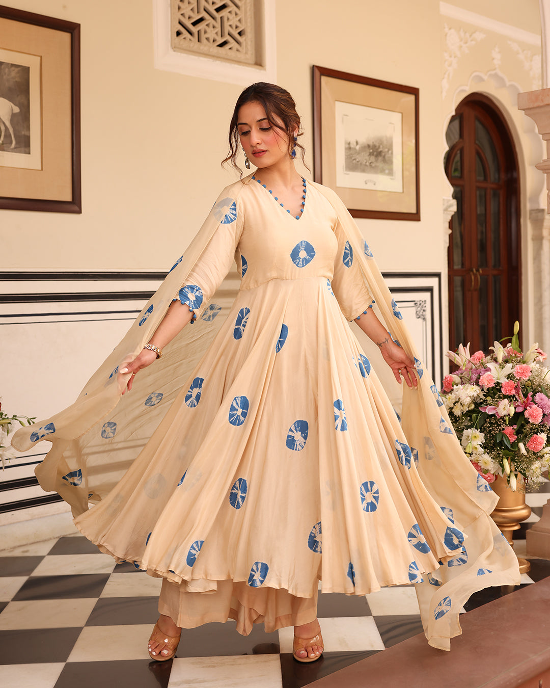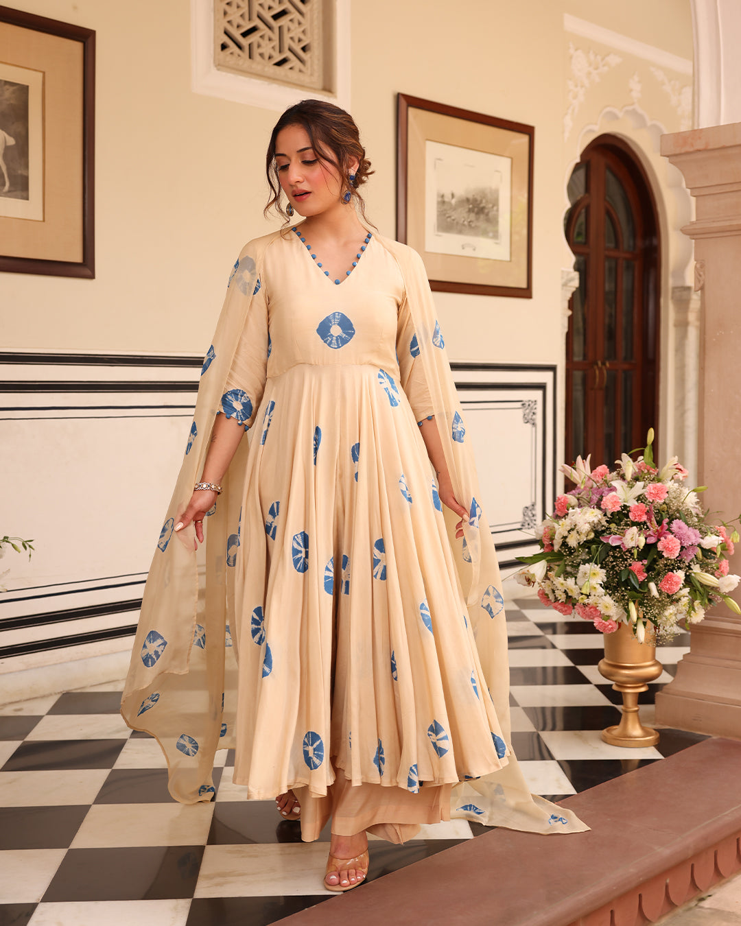 This set includes kurta with pant and dupatta. Kurta lined with mul. Kurta & dupatta is tie & die technic.