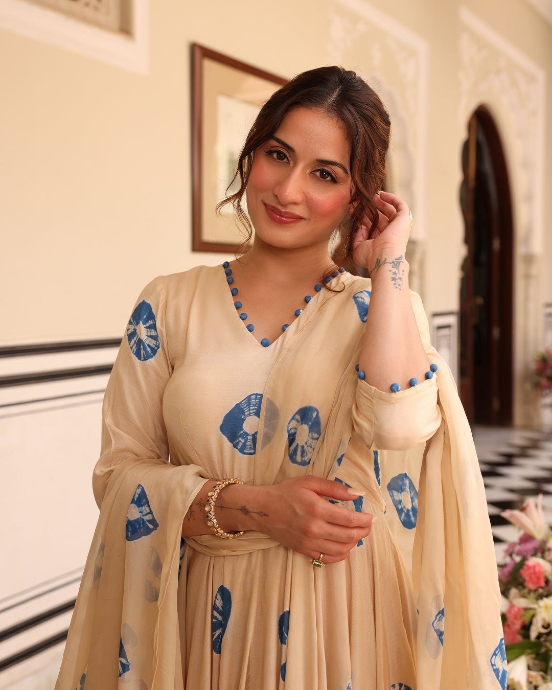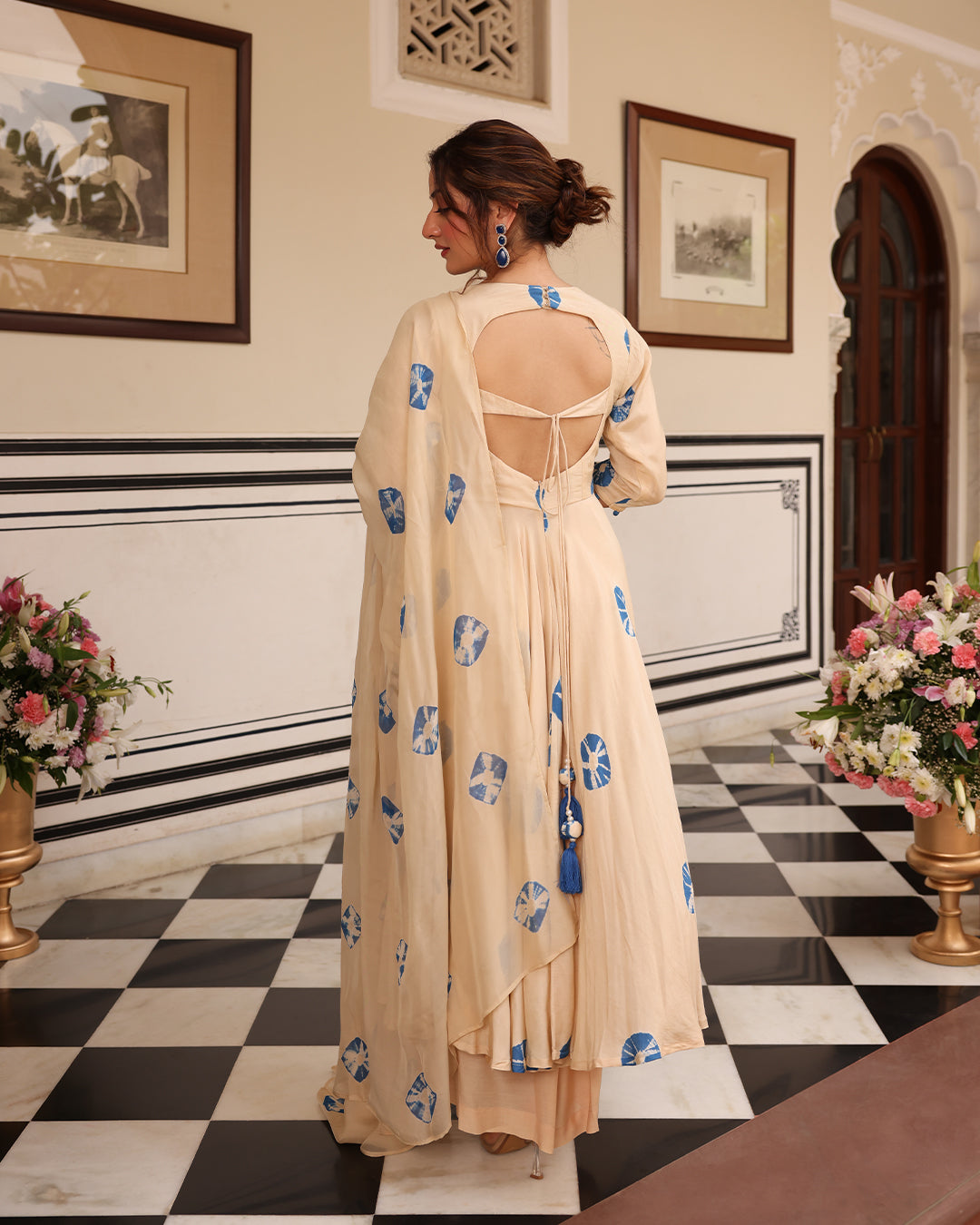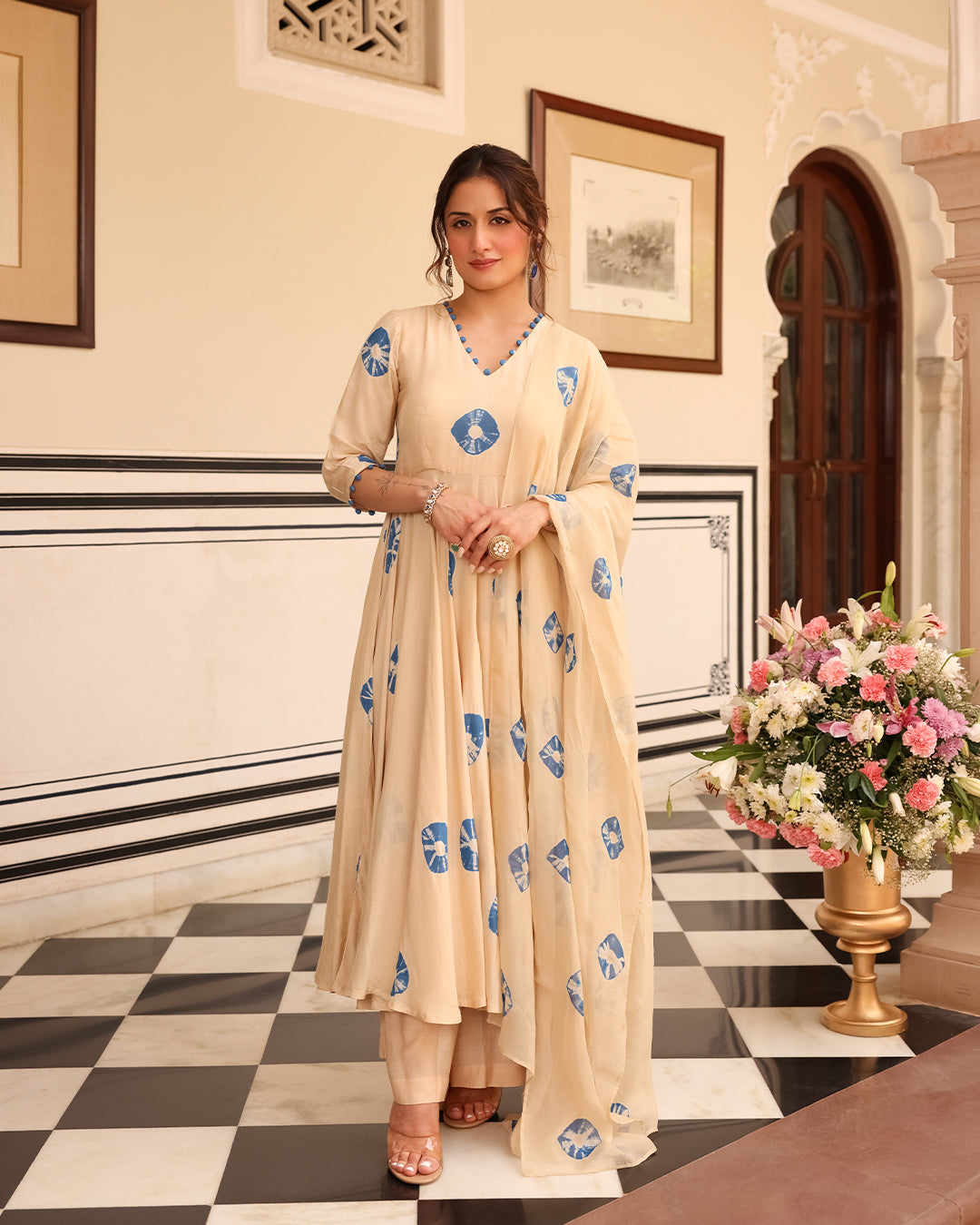 This set includes kurta with pant and dupatta. Kurta lined with mul. Kurta & dupatta is tie & die technic.