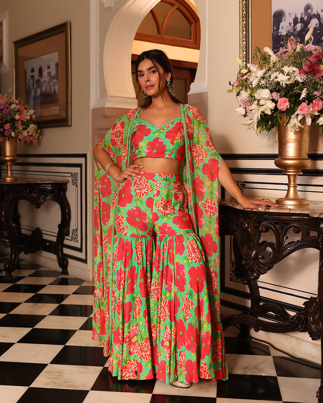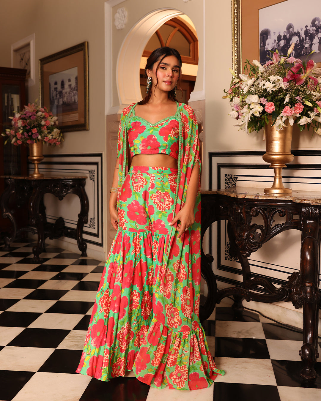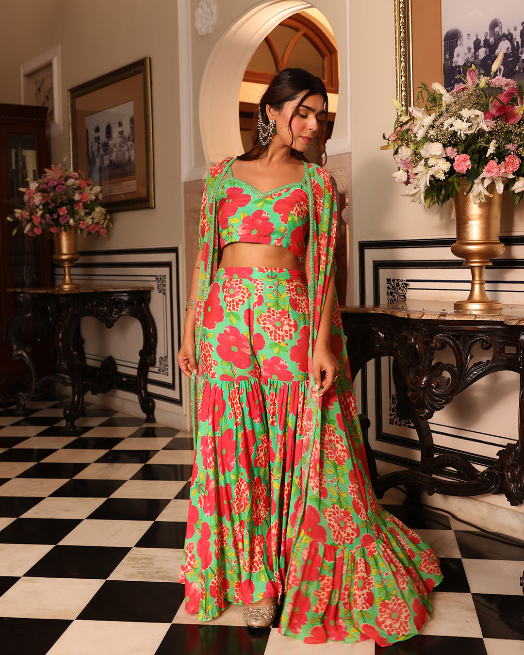 - Details: Sharara Length- 40", Blouse Length- 14" ,Jacket Length- 52",