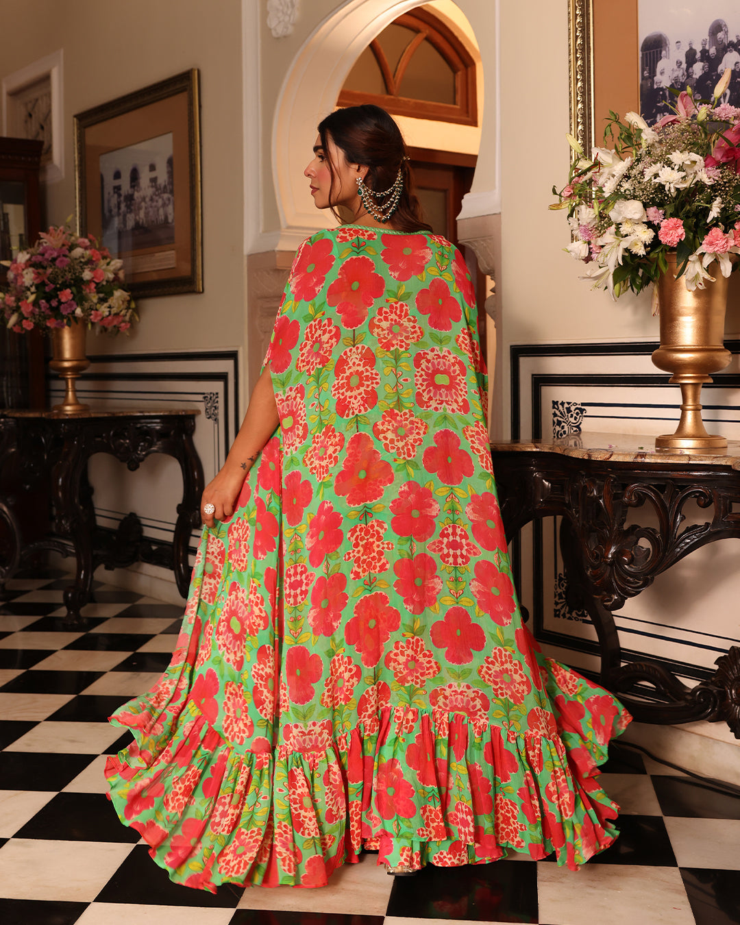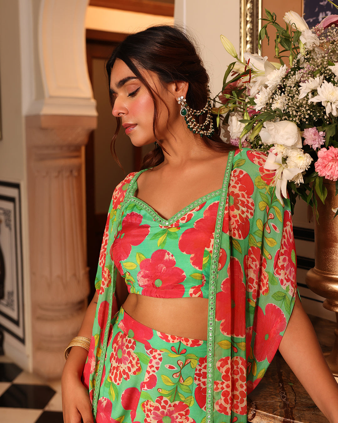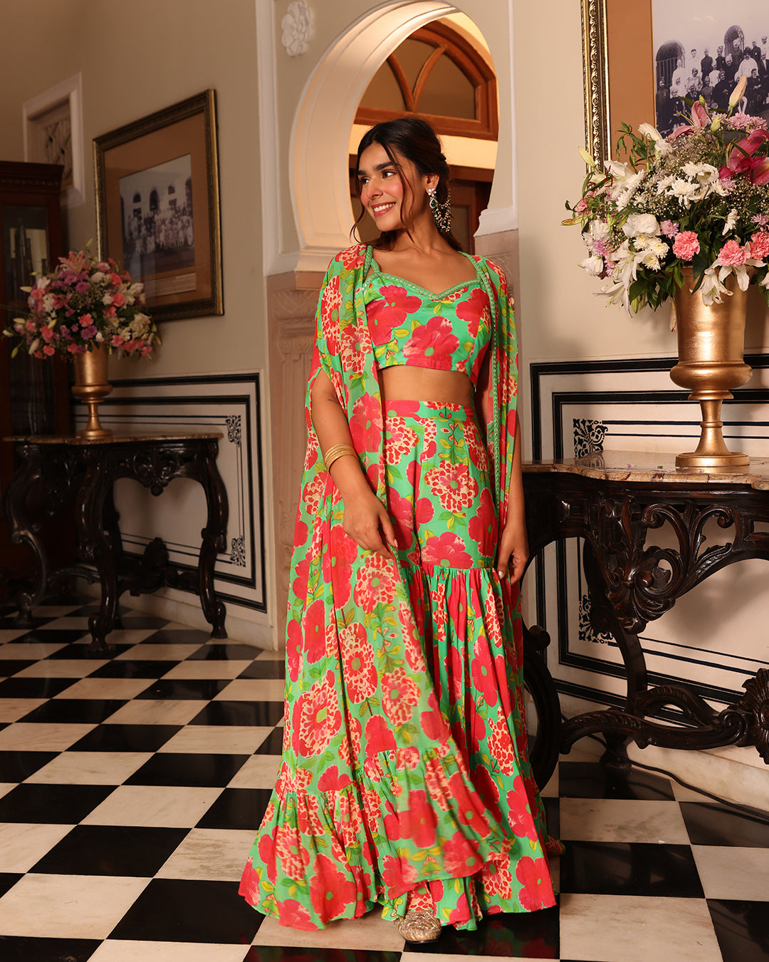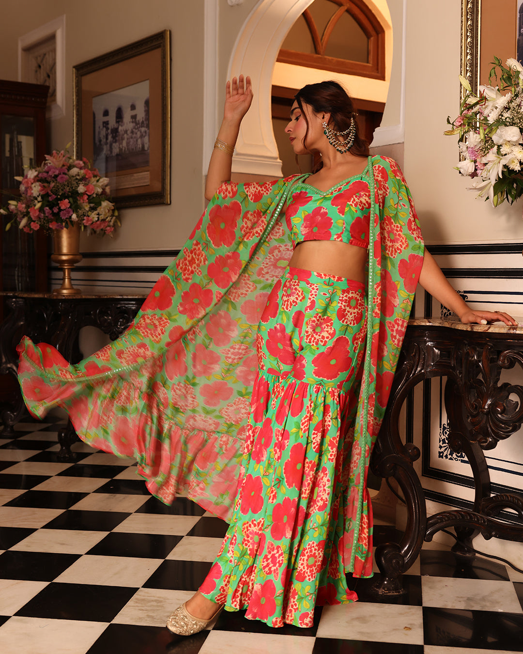 - Details: Sharara Length- 40", Blouse Length- 14" ,Jacket Length- 52",