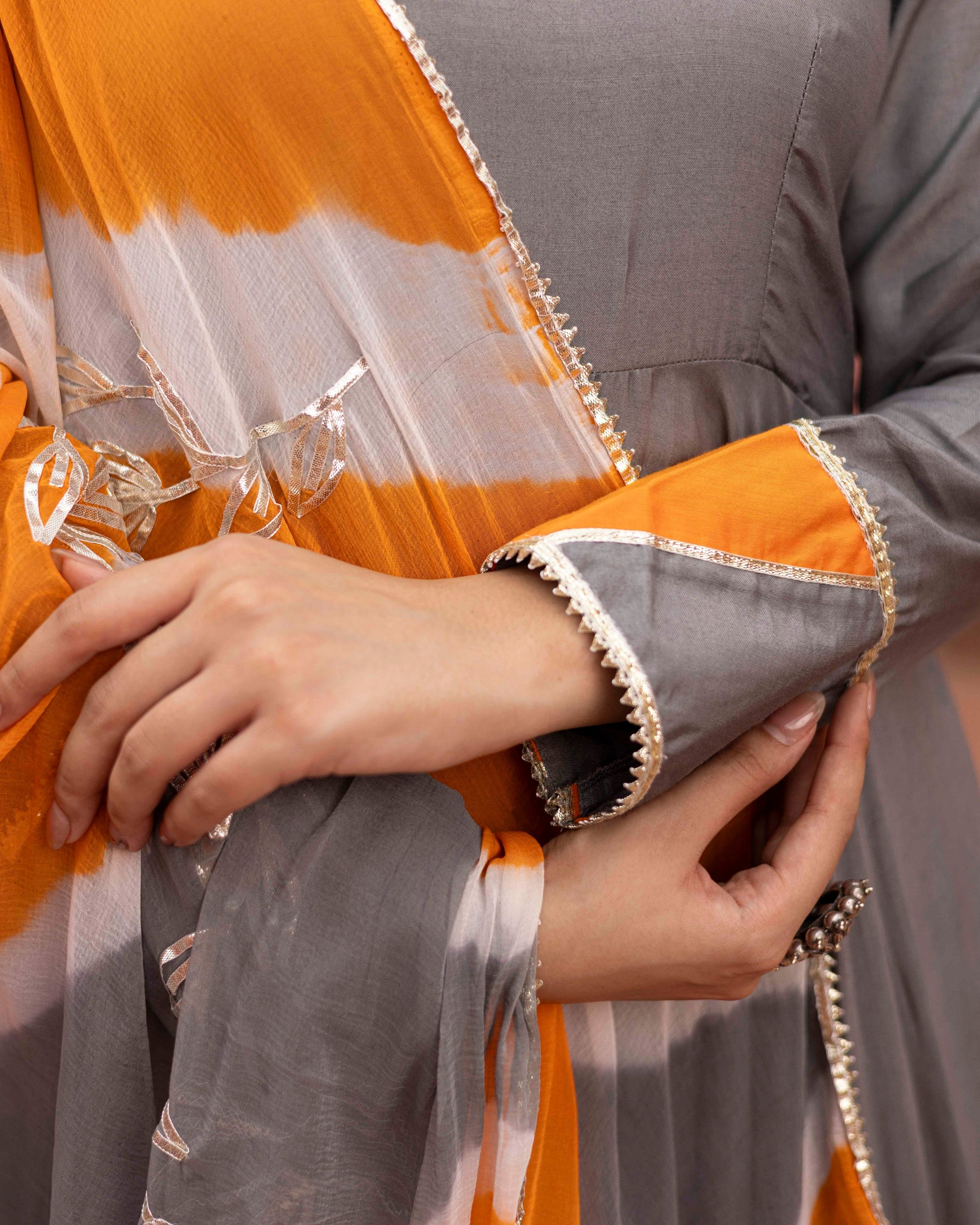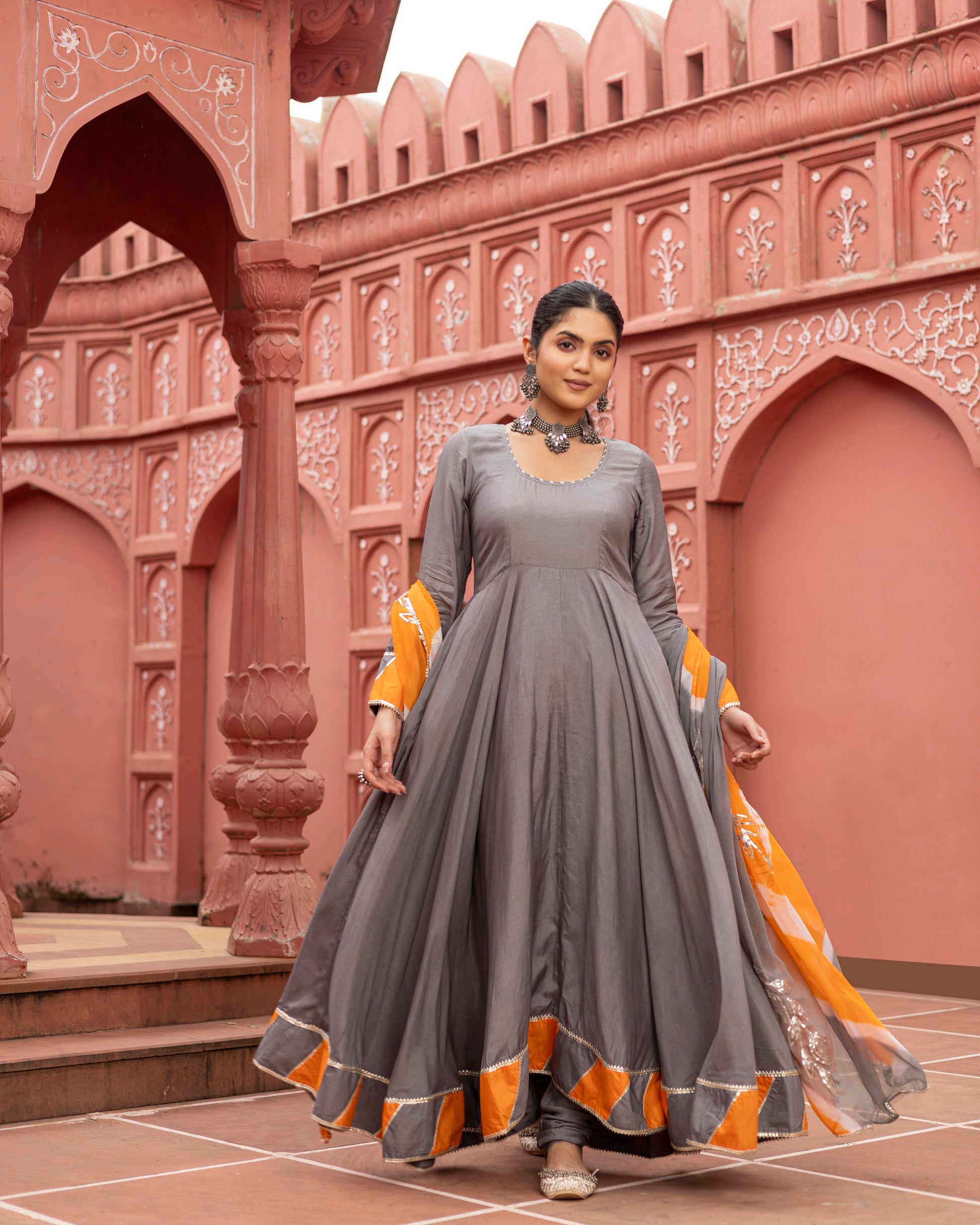 This set includes anarkali with pant and dupatta. Anarkali lined with mul. Dupatta is detailed with Gotta Patti work.