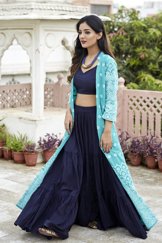 Turquoise Blue Jacket With Layered Skirt & Blouse