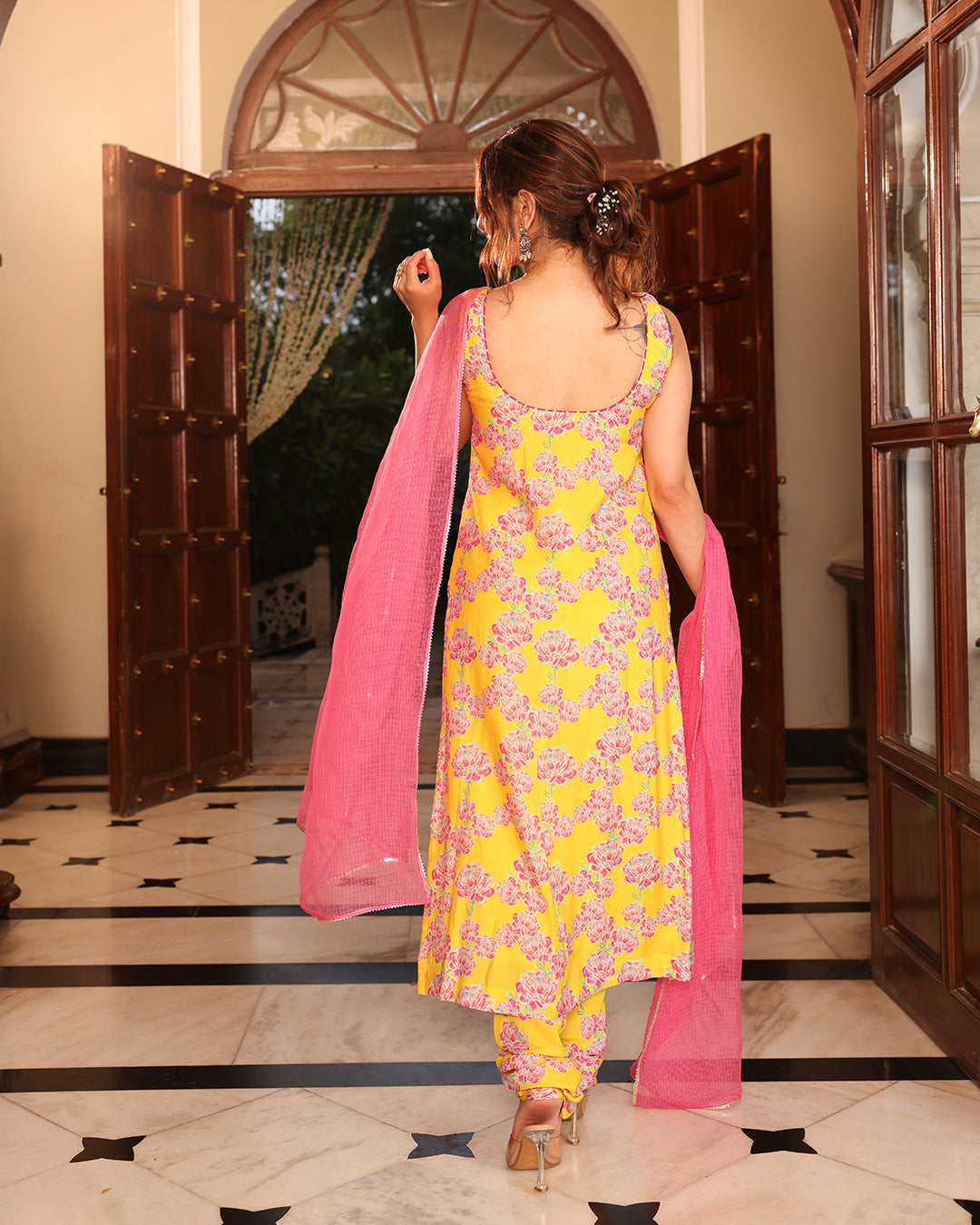 This set include Straight Kurta with pant and Kota Doria dupatta.Kurta and dupatta is digital printed